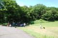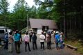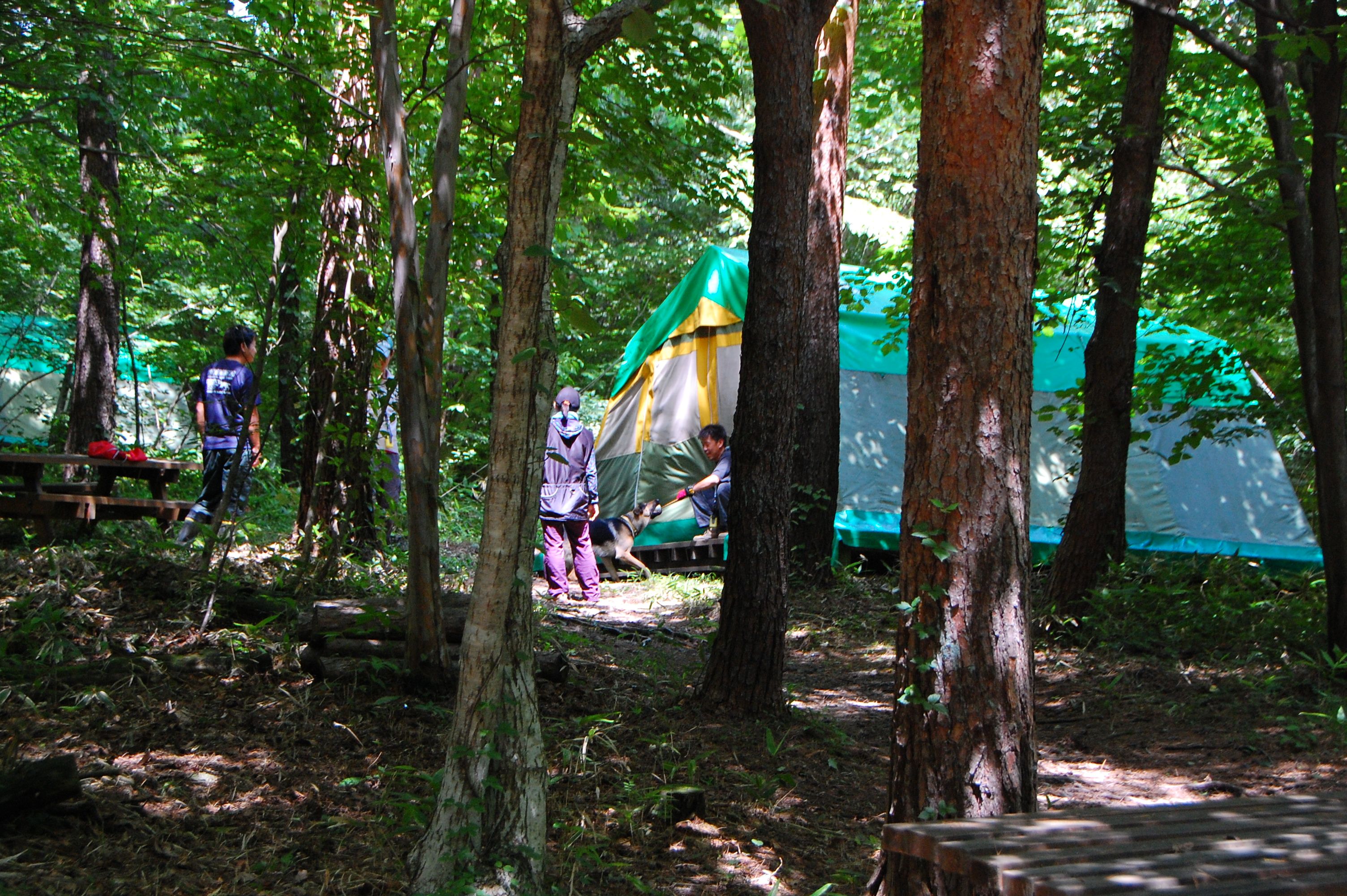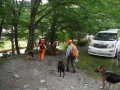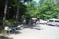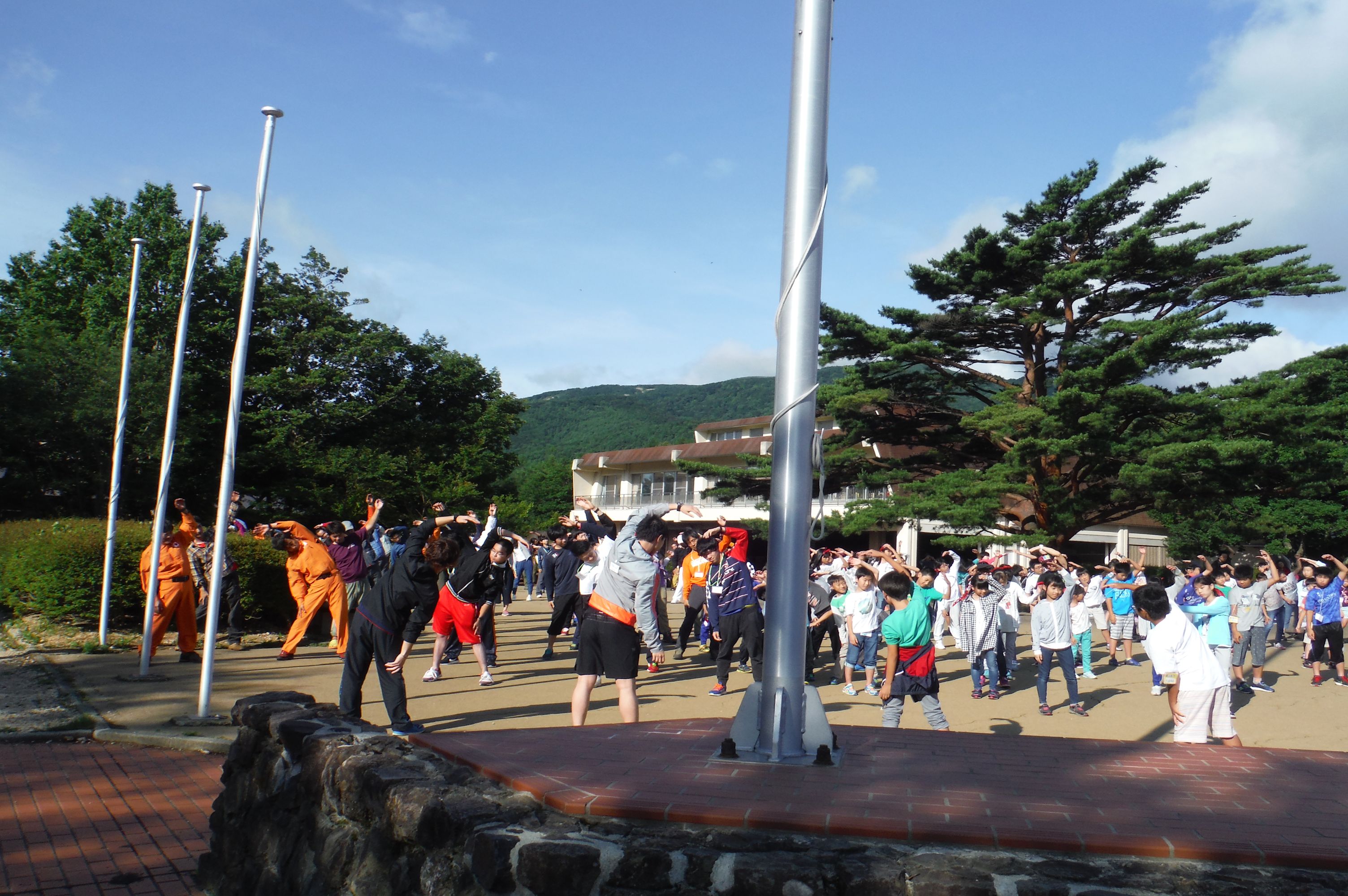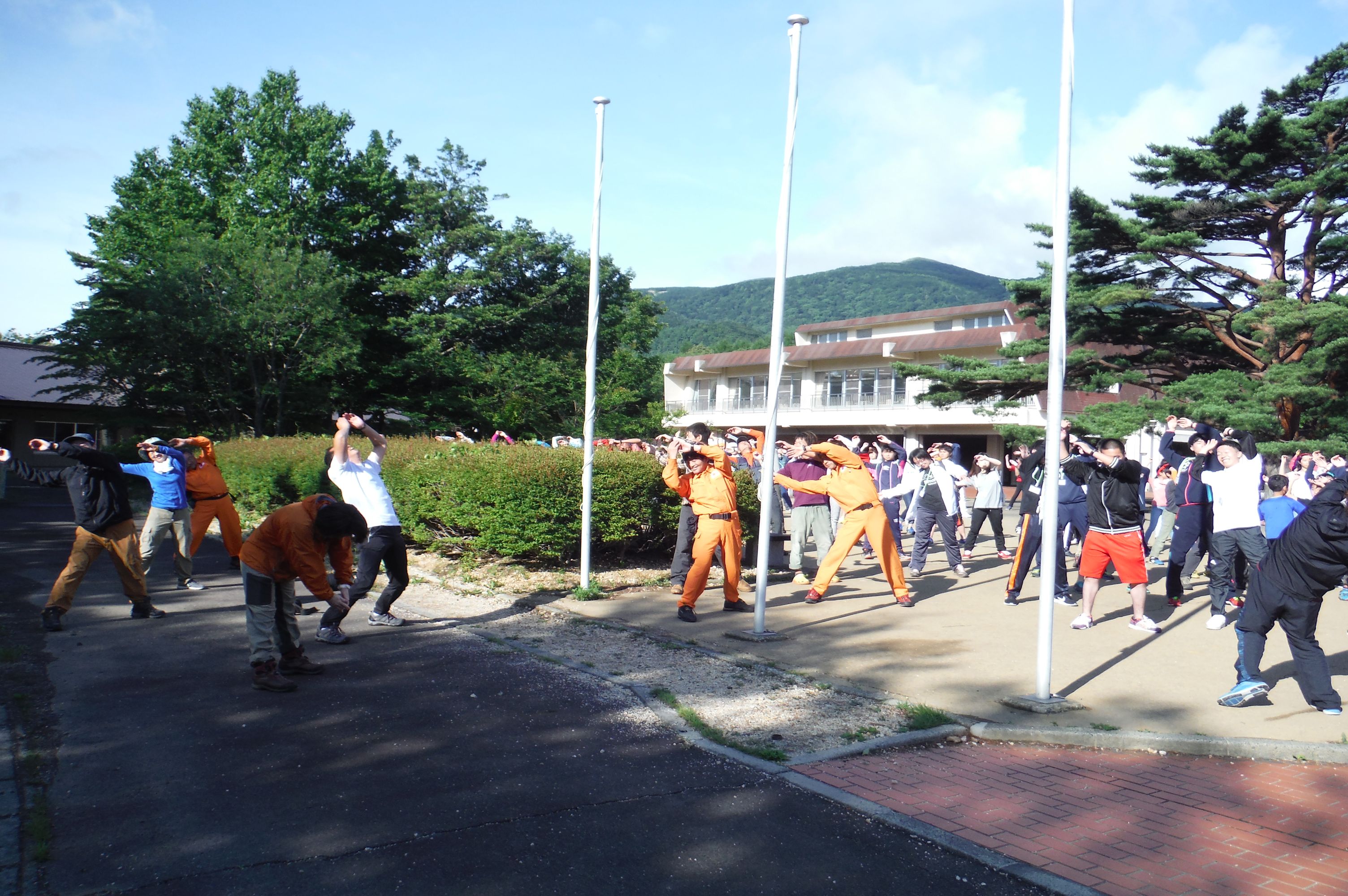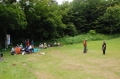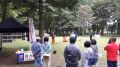 朝のラジオ体操から1日が始まる。熊の目撃情報もあり鈴を付けて訓練に入る。キャンプ場は木立の中で涼しい。