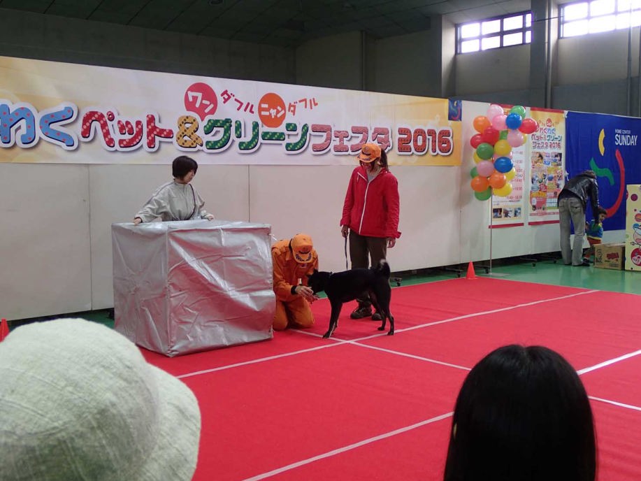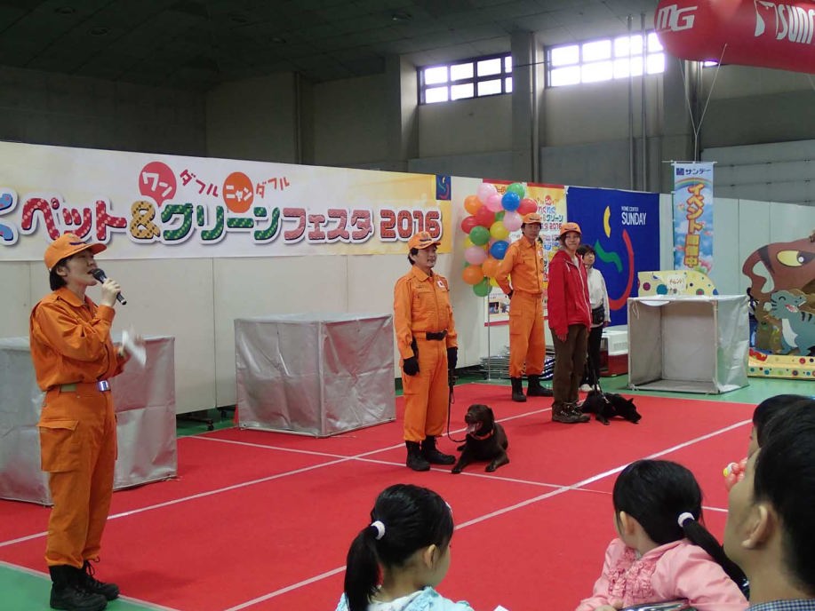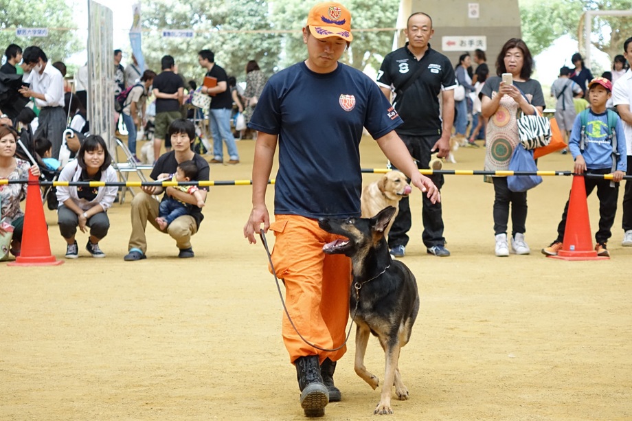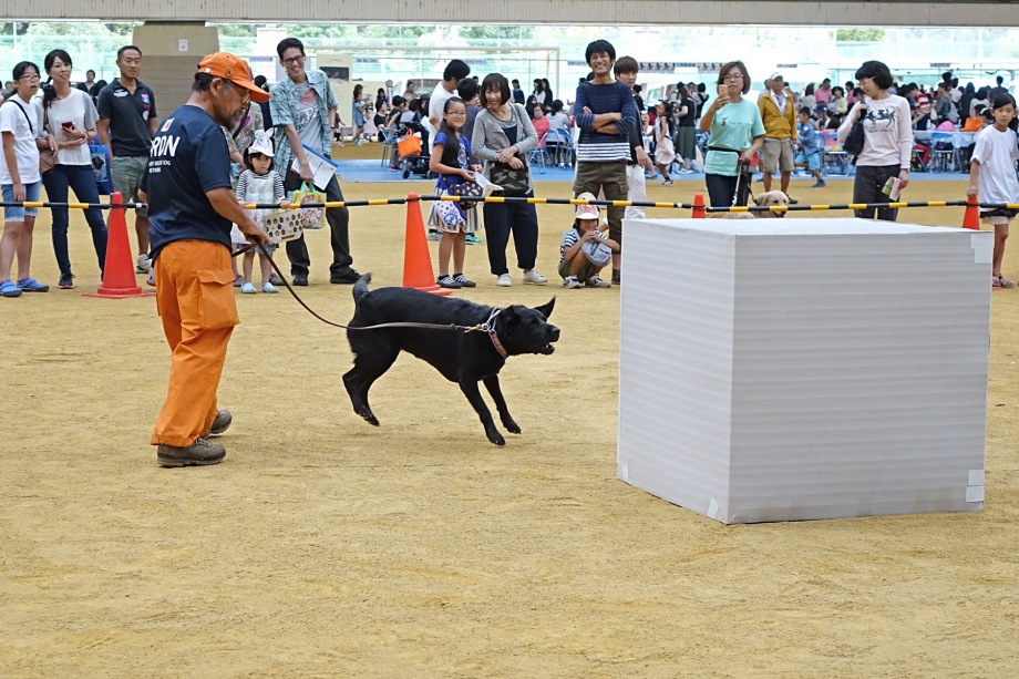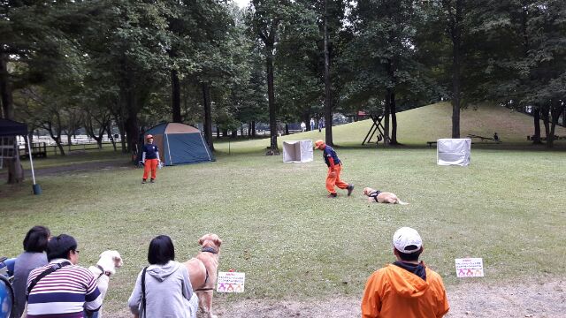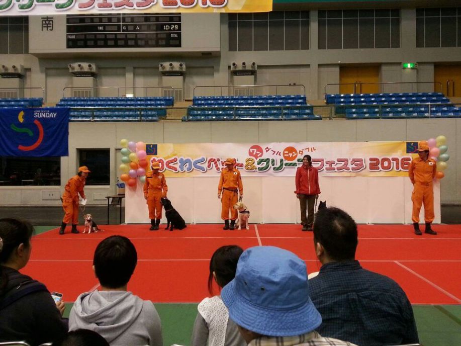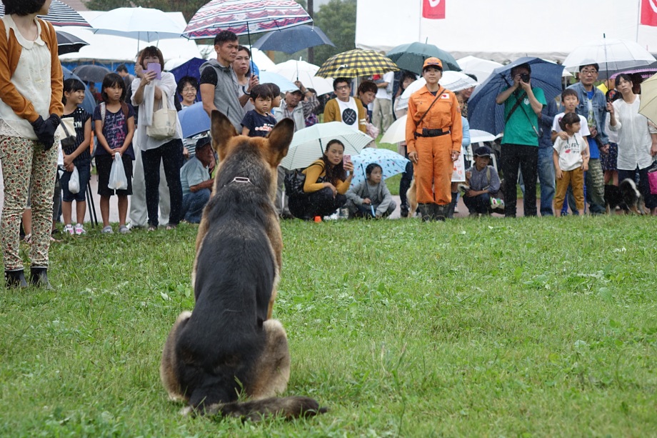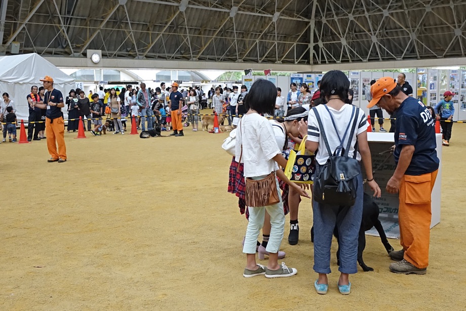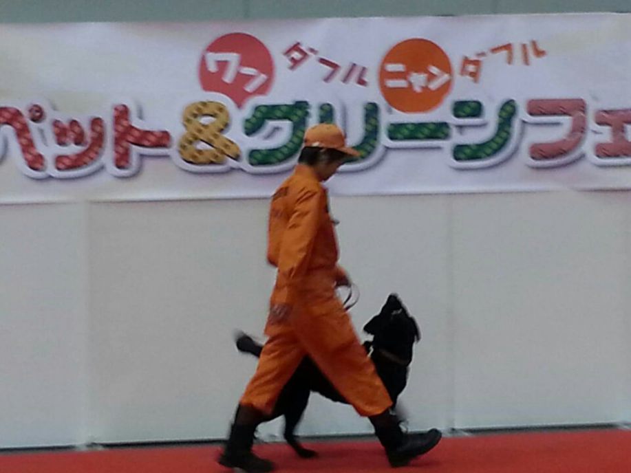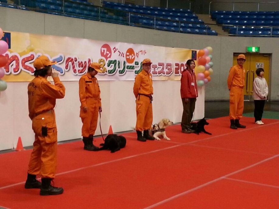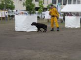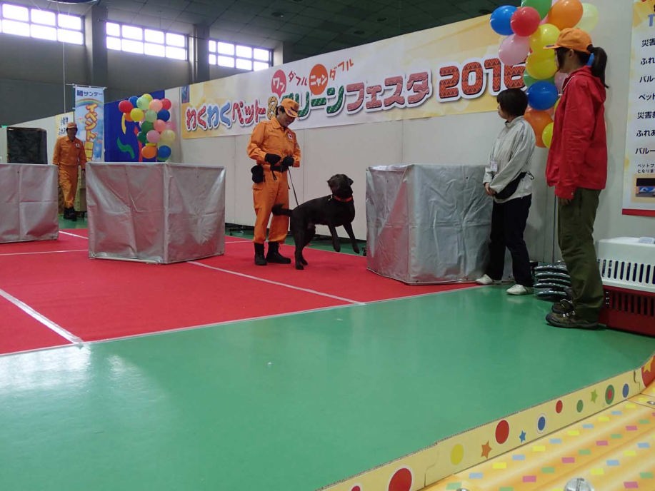 あいにくの雨であったが全天候型の大きな施設で毎年来場者も何千人規模である。会場中央で周囲にはたくさんの方々に注目されてのデモである。私たちは災害救助犬であることに不可欠な服従作業は必ず見てもらう。そこで拍手が起こるぐらいの服従を見せる必要がある。隠れている人を見つけるイメージが先行しがちであるが、使役犬である以上、期待される役目を果たすためには、人々の要望を汲み取れるハンドラーの指示に基づいて作業できなければ成り立たない。偶然ではないことを知ってもらいたい。動物愛護フェスティバルなので犬連れも多いが、ペットとしてだけでなく、犬の能力を生かして一緒に楽しむことも考えてもらえればありがたい。