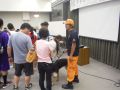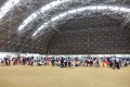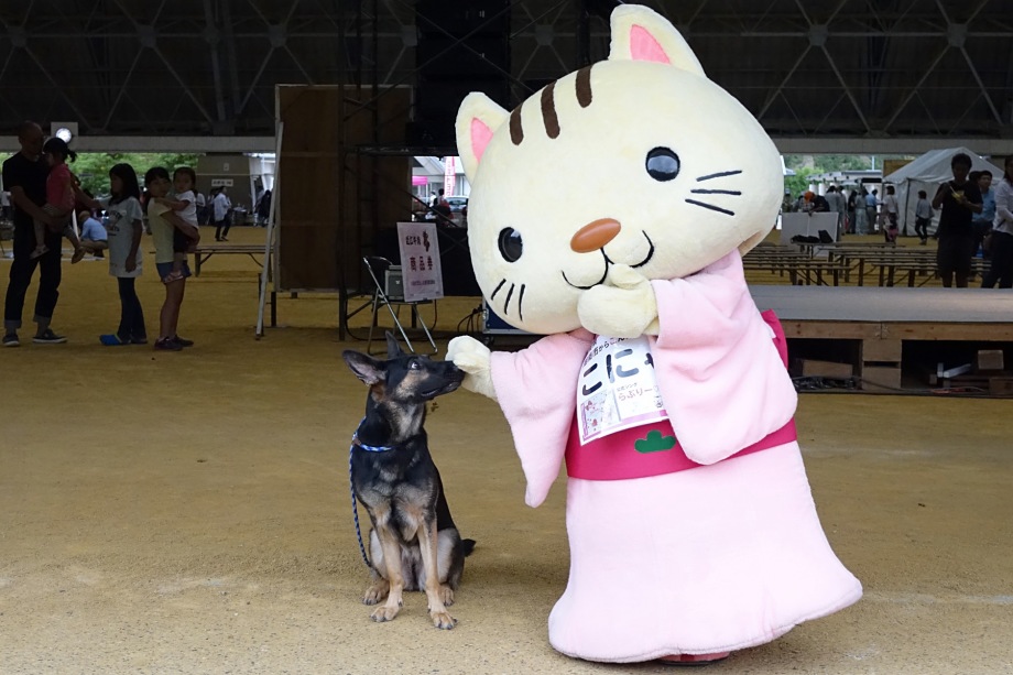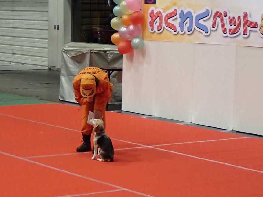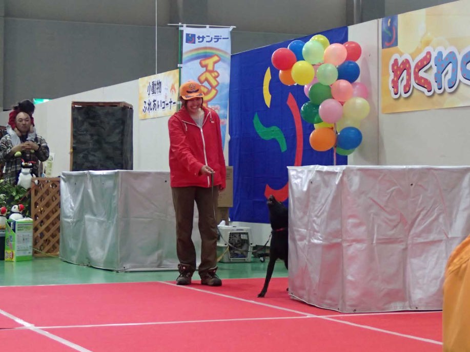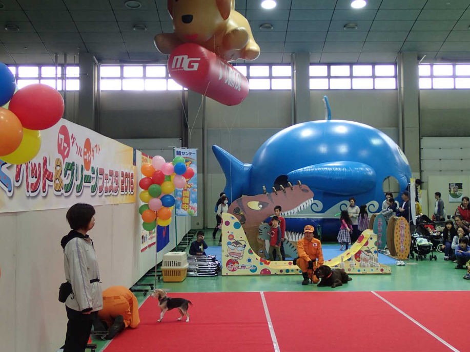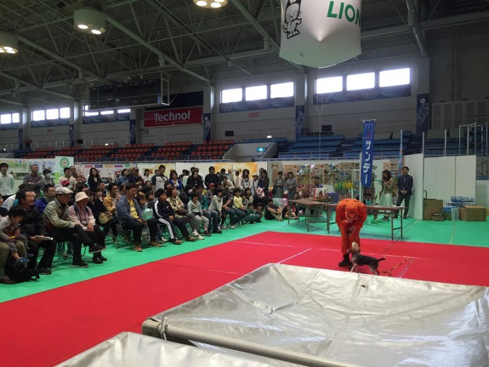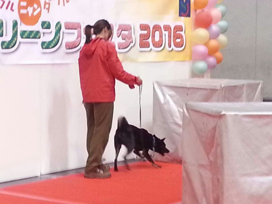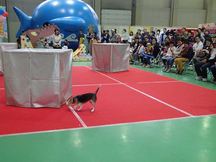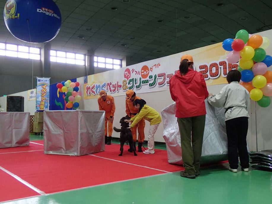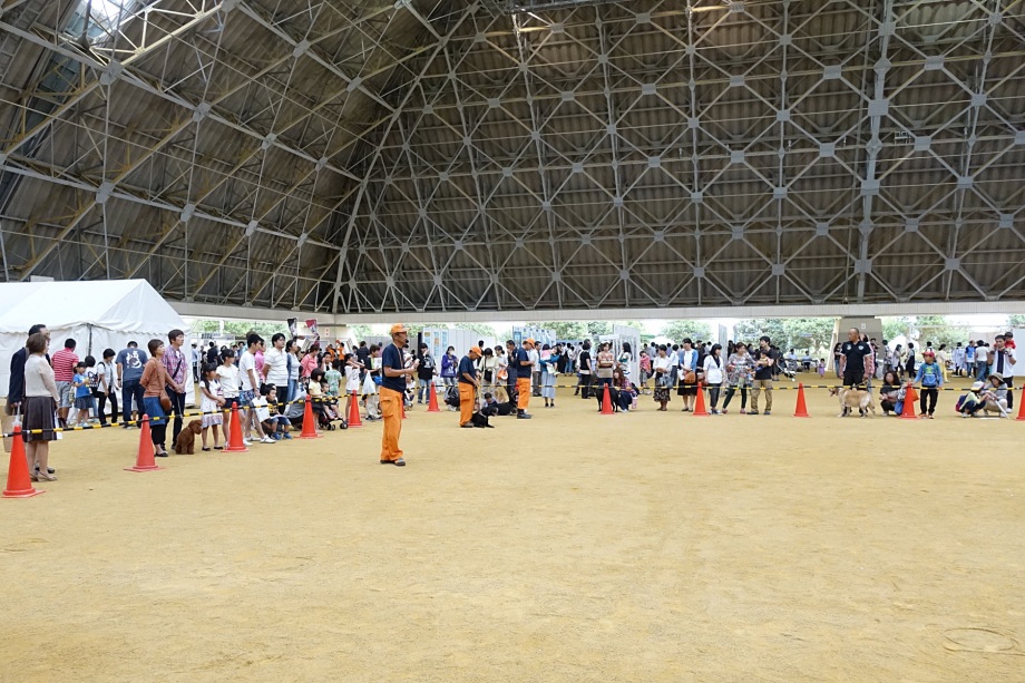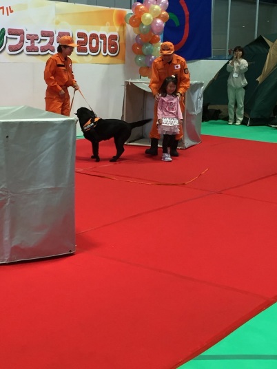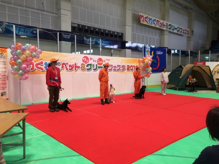 あいにくの雨であったが全天候型の大きな施設で毎年来場者も何千人規模である。会場中央で周囲にはたくさんの方々に注目されてのデモである。私たちは災害救助犬であることに不可欠な服従作業は必ず見てもらう。そこで拍手が起こるぐらいの服従を見せる必要がある。隠れている人を見つけるイメージが先行しがちであるが、使役犬である以上、期待される役目を果たすためには、人々の要望を汲み取れるハンドラーの指示に基づいて作業できなければ成り立たない。偶然ではないことを知ってもらいたい。動物愛護フェスティバルなので犬連れも多いが、ペットとしてだけでなく、犬の能力を生かして一緒に楽しむことも考えてもらえればありがたい。