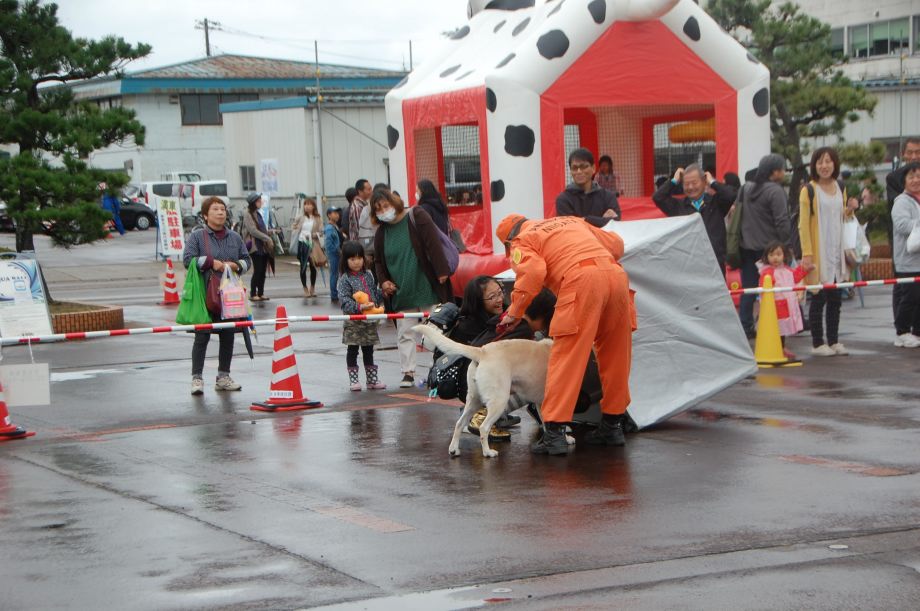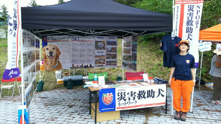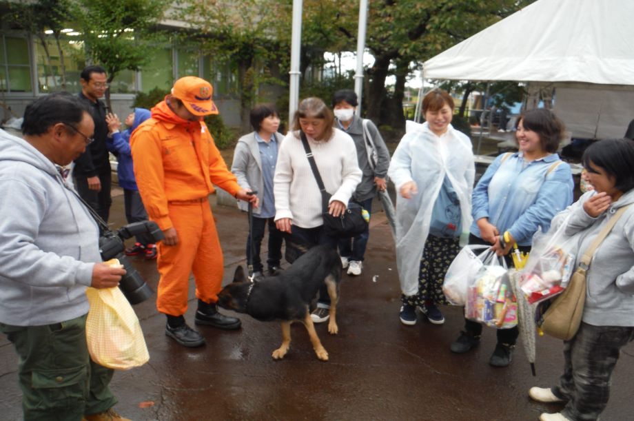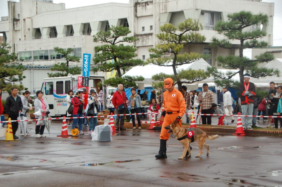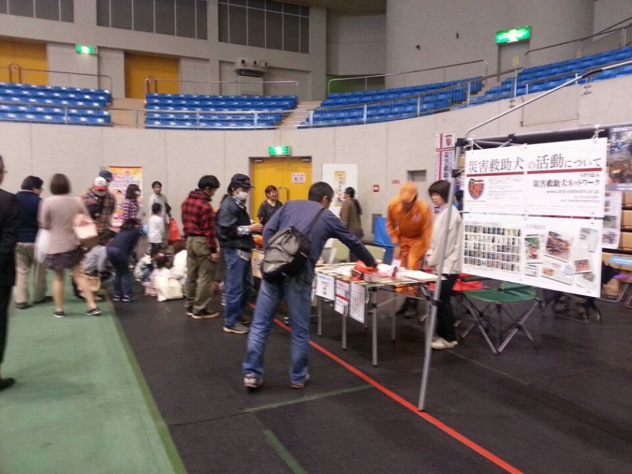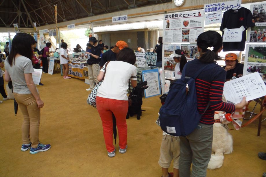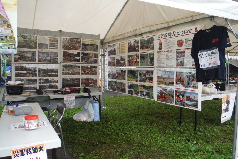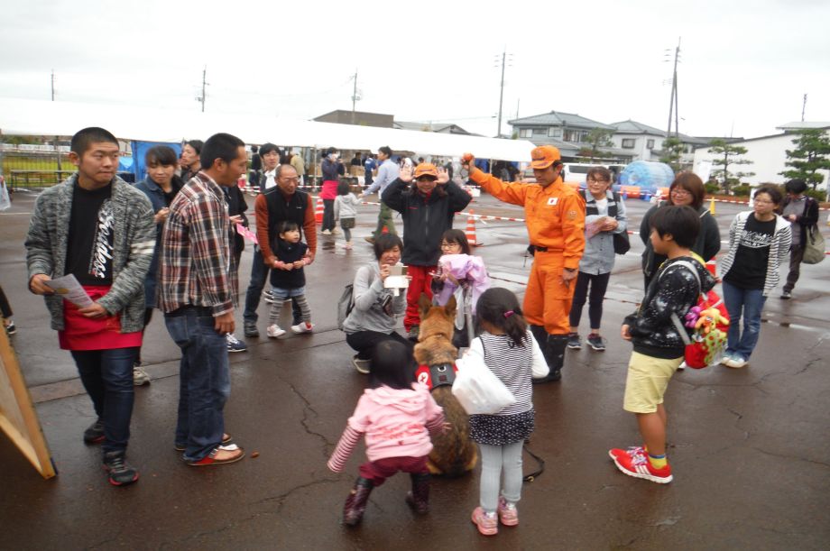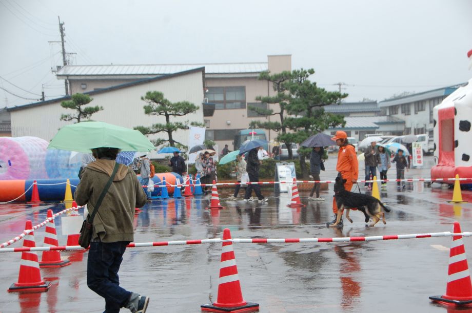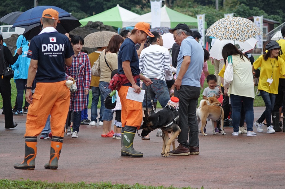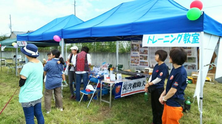 東日本大震災の被災を受けて防災意識も高く、町を挙げて取り組んでいる様子である。災害救助犬への期待も感じ広報ブースでも質問を多く受けた。支援の募金もたくさんいただきありがとうございました。