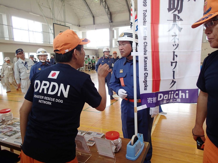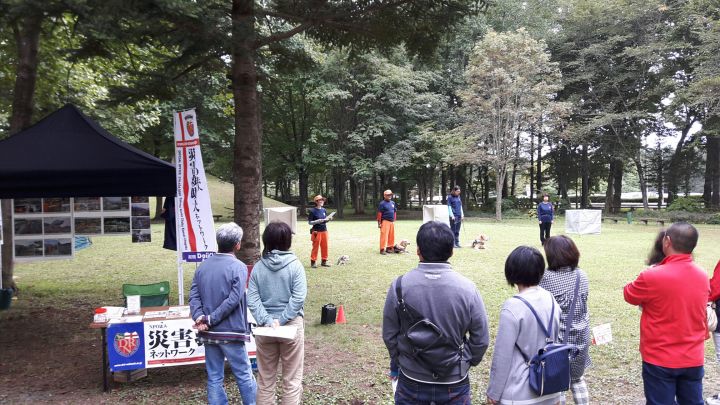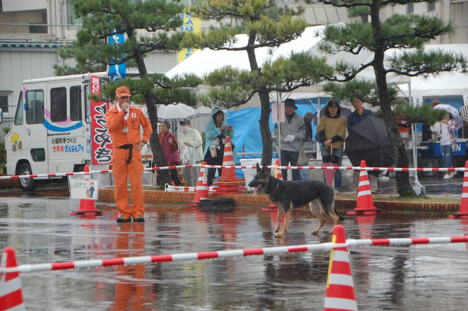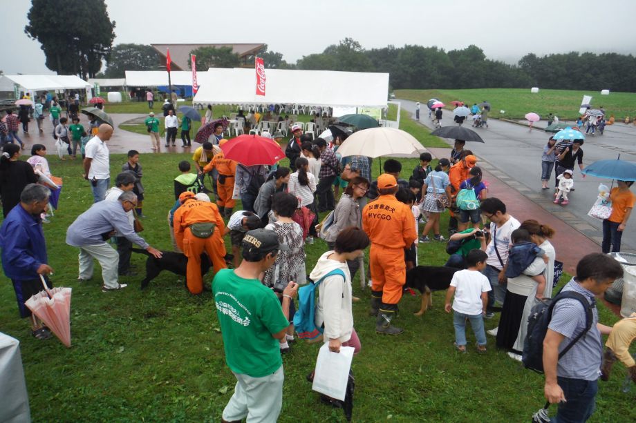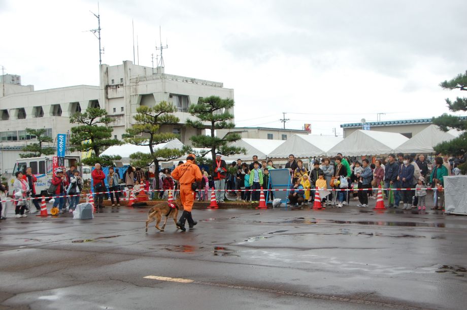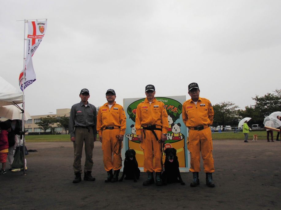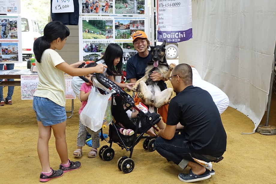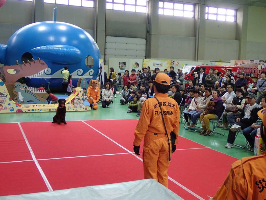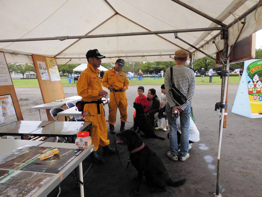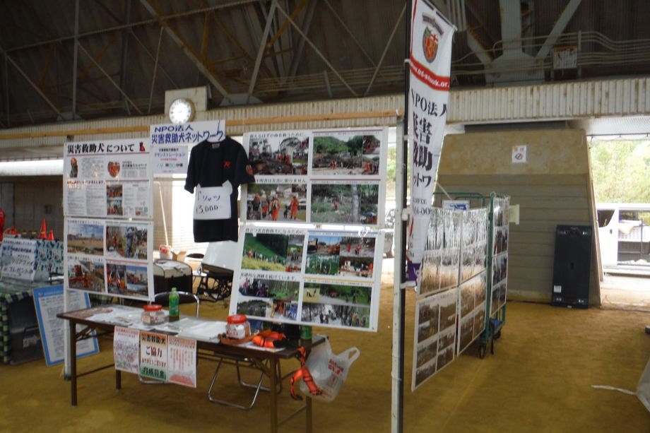 東日本大震災の被災を受けて防災意識も高く、町を挙げて取り組んでいる様子である。災害救助犬への期待も感じ広報ブースでも質問を多く受けた。支援の募金もたくさんいただきありがとうございました。