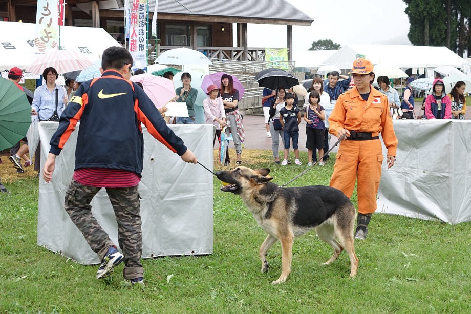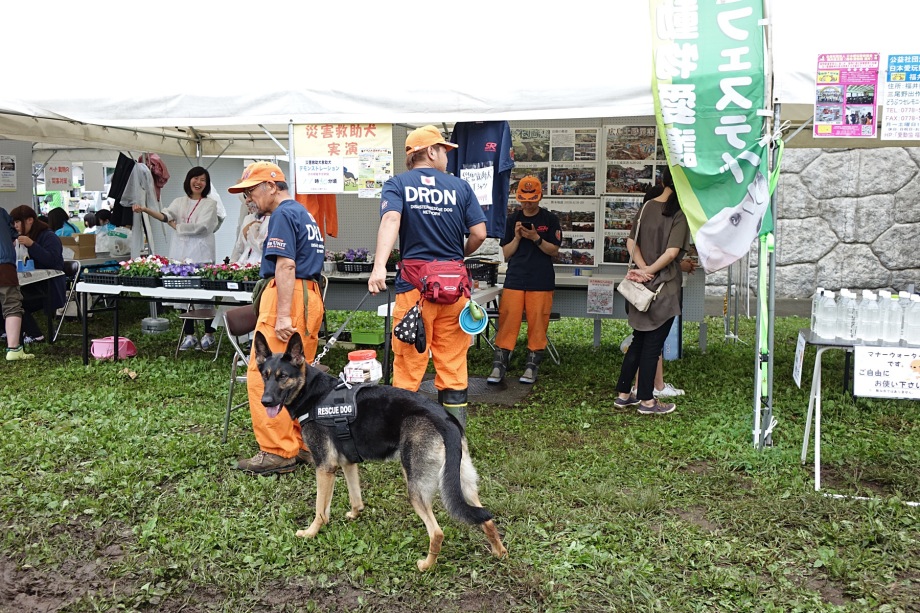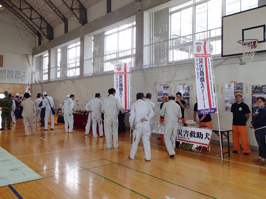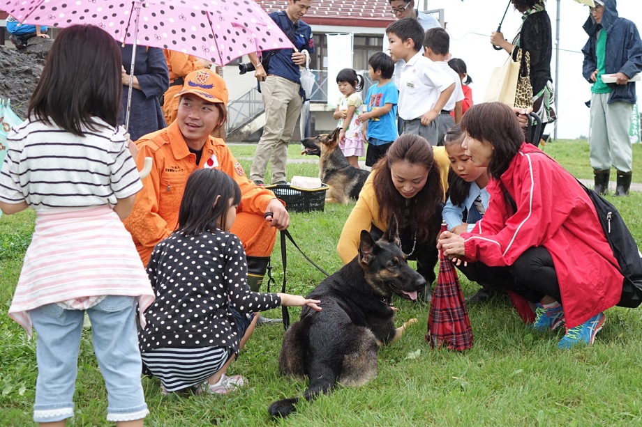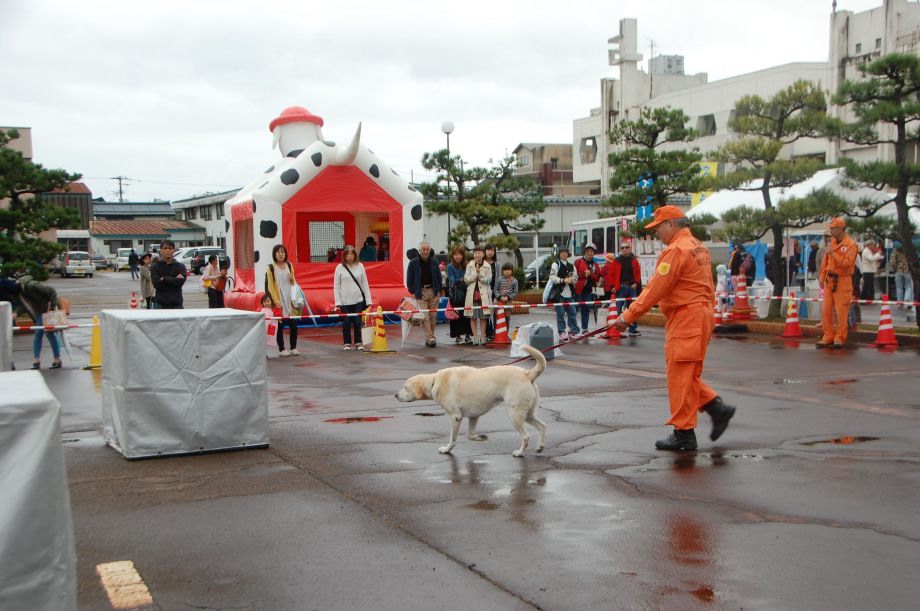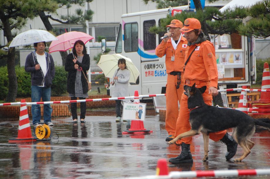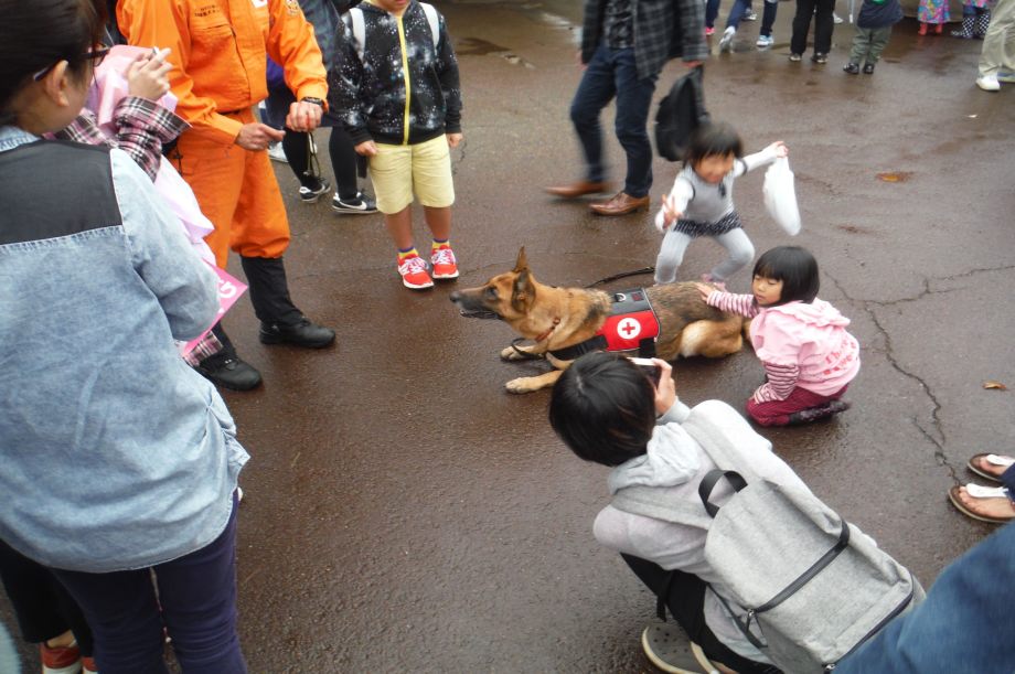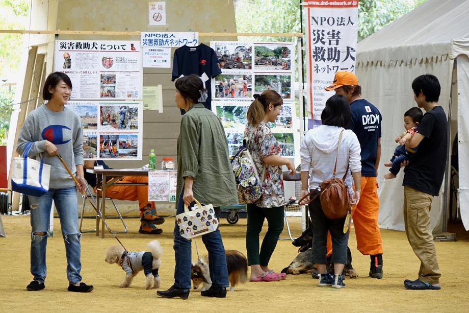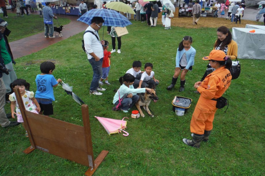 東日本大震災の被災を受けて防災意識も高く、町を挙げて取り組んでいる様子である。災害救助犬への期待も感じ広報ブースでも質問を多く受けた。支援の募金もたくさんいただきありがとうございました。