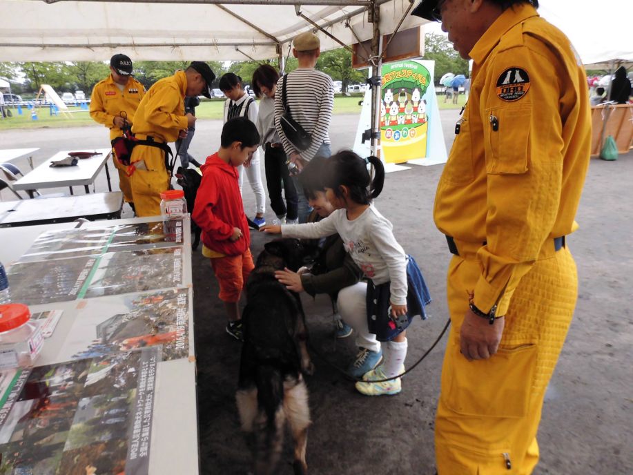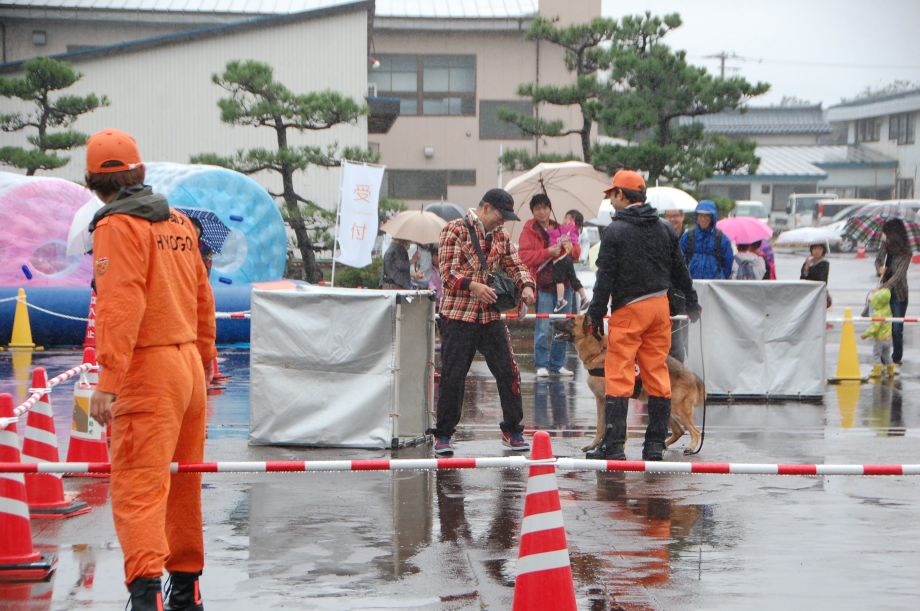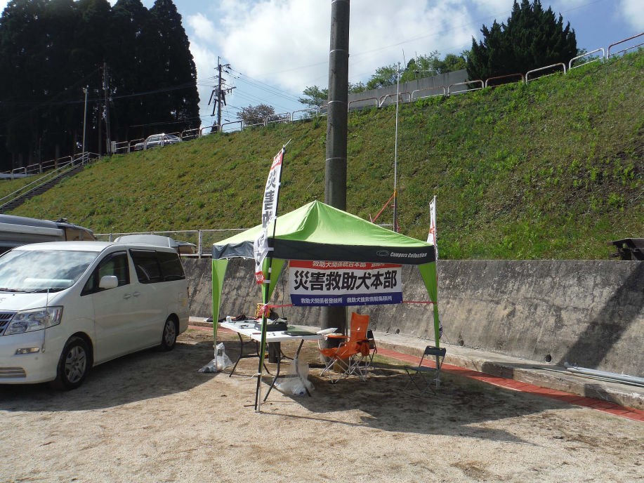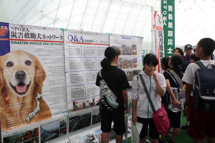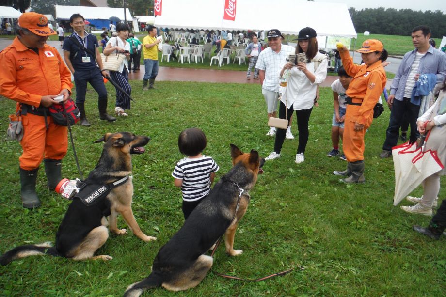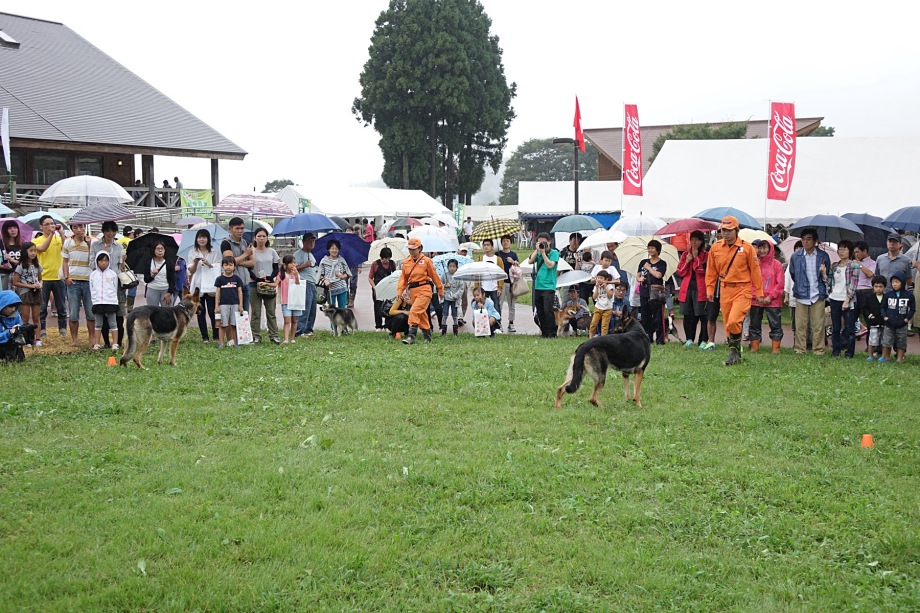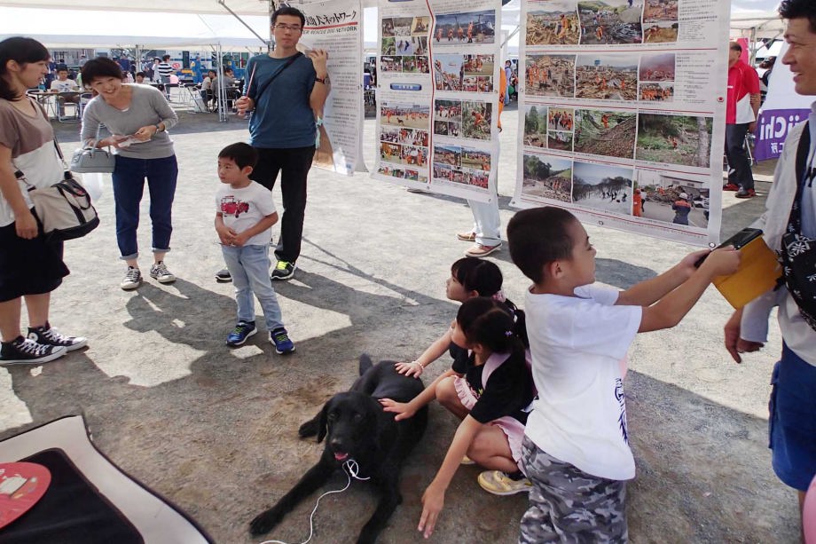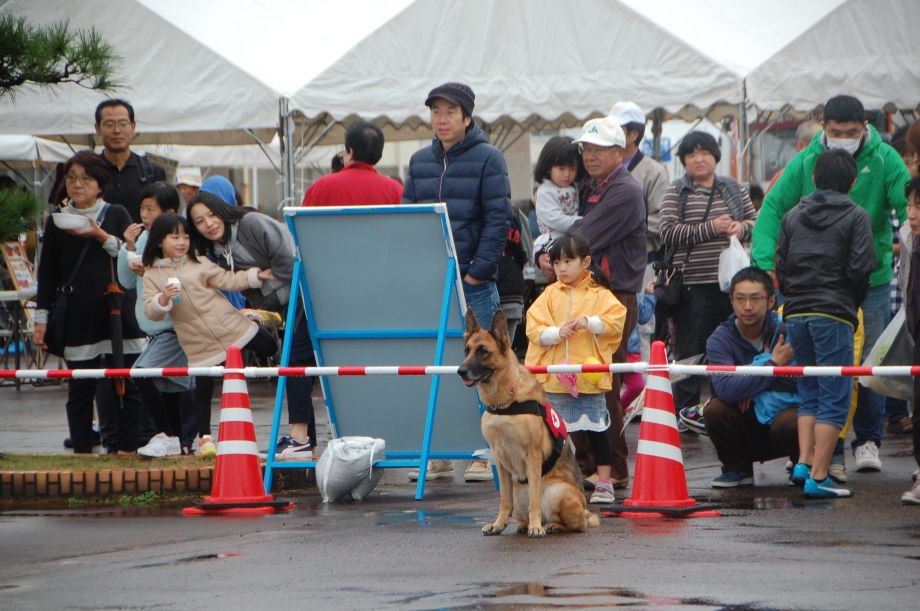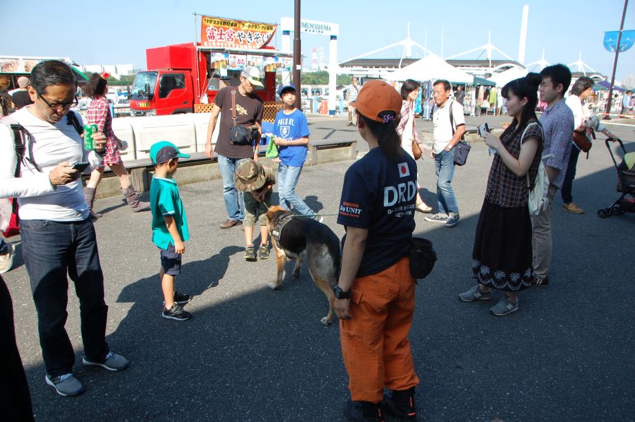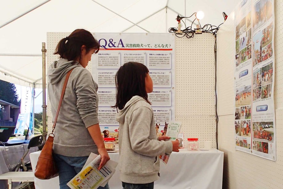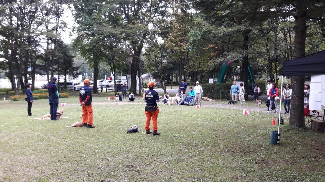 東日本大震災の被災を受けて防災意識も高く、町を挙げて取り組んでいる様子である。災害救助犬への期待も感じ広報ブースでも質問を多く受けた。支援の募金もたくさんいただきありがとうございました。