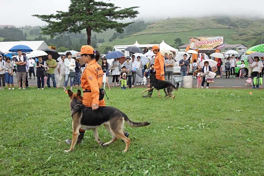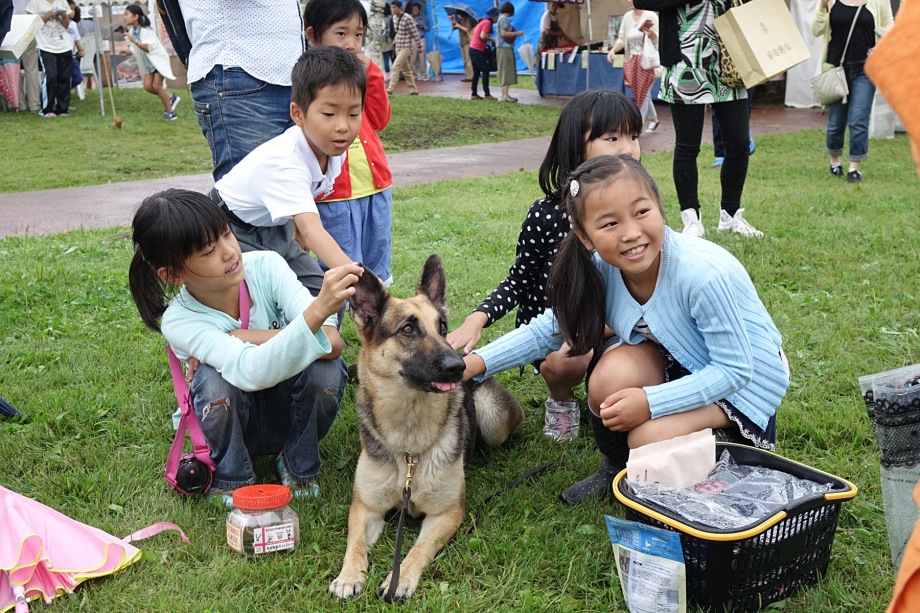 台風が近づき大雨警報も出て開催が心配されたが、当日は曇り時々雨で来場者も比較的多い印象であった。手前みそながら災害救助犬のデモの時間には観客が集まっていただいた。シェパード2頭並列の服従作業には多くの拍手をいただき、あらためて使役犬としての期待を感じる。災害救助犬、ボランティアの活動実態もしっかり伝えたい。ふれあいタイムはいつまでも続き、子供たちはシェパードとボールで遊んでいた。いい思い出となって覚えていてくれればありがたい。