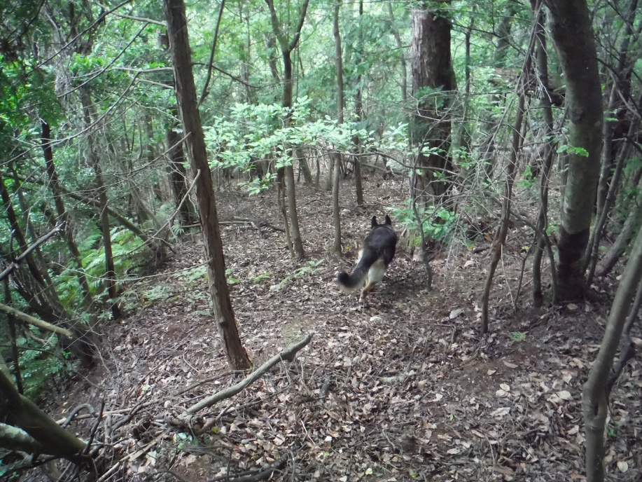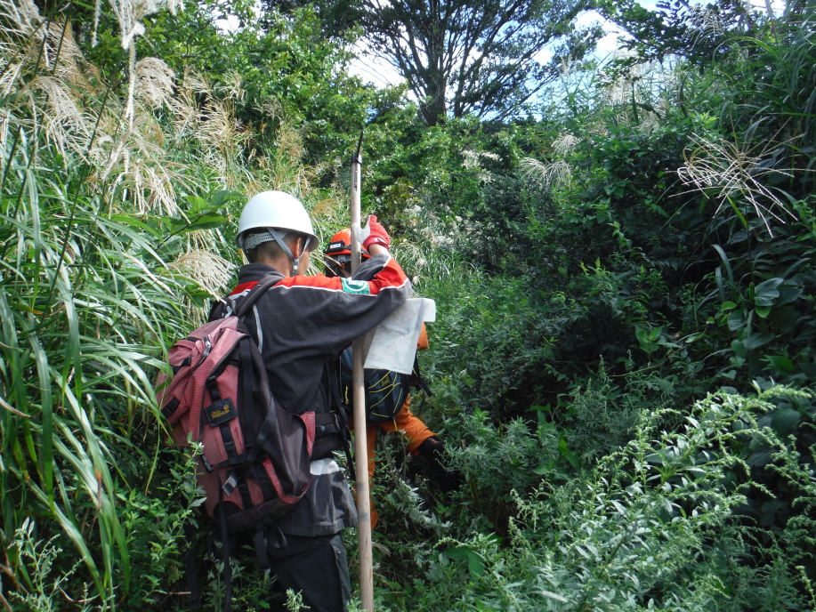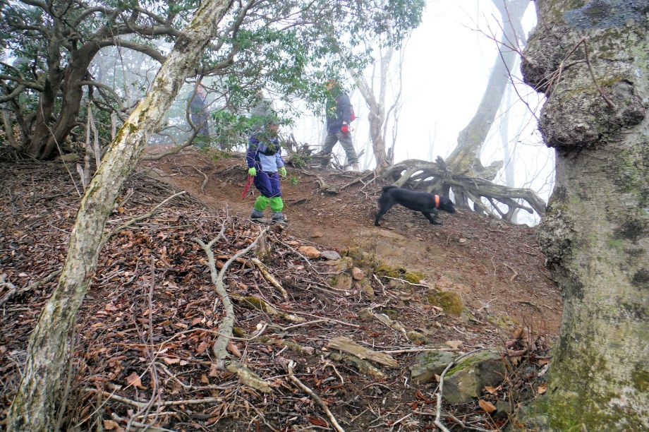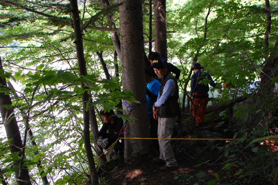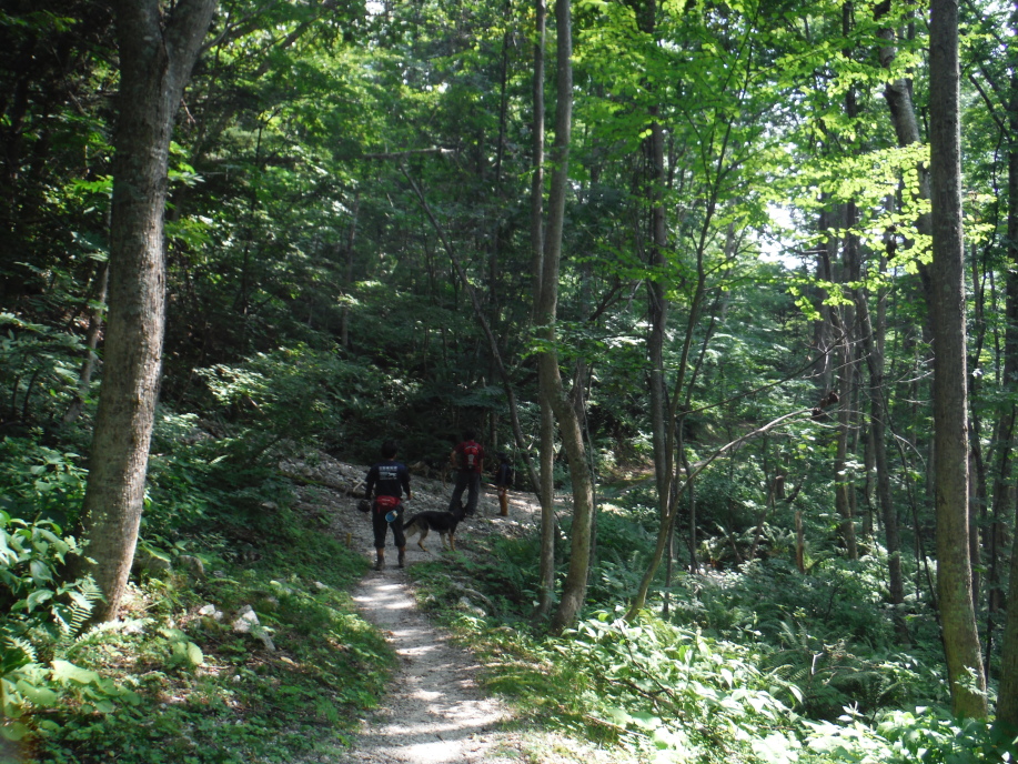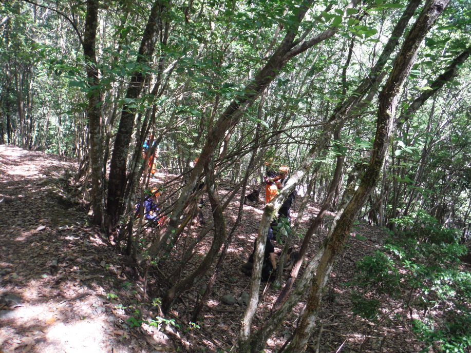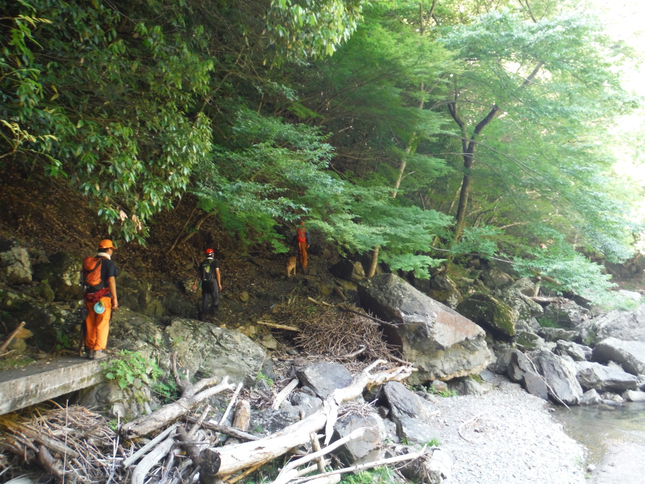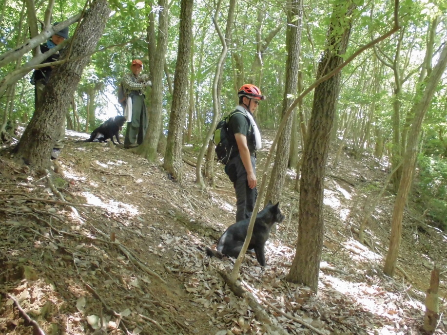 警察からの情報をもとに、京都府山岳連盟との連携で、当会は犬の特性を生かせるであろう南側の尾根筋、山岳会は北側の沢筋に分けて捜索を行った。時間の経過を考え必要と思われる作業準備を早朝に行い入山した。弁解になるが、当日は30度を超え、人犬ともに持続性、集中力を発揮できず、成果には結びつけられなかった。