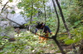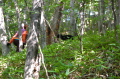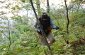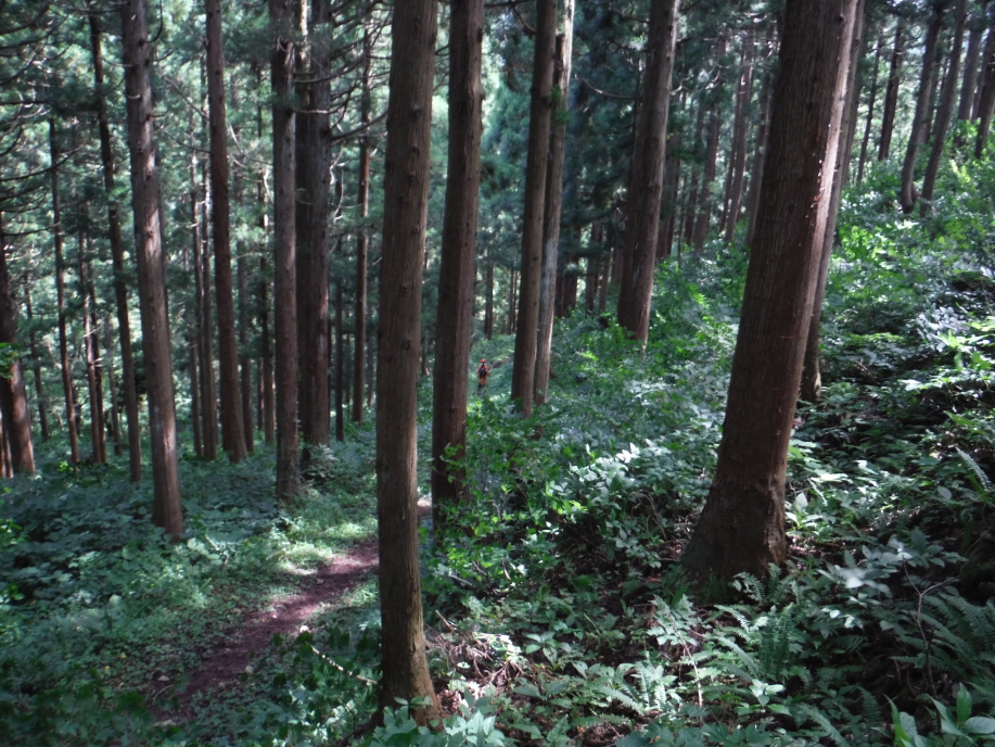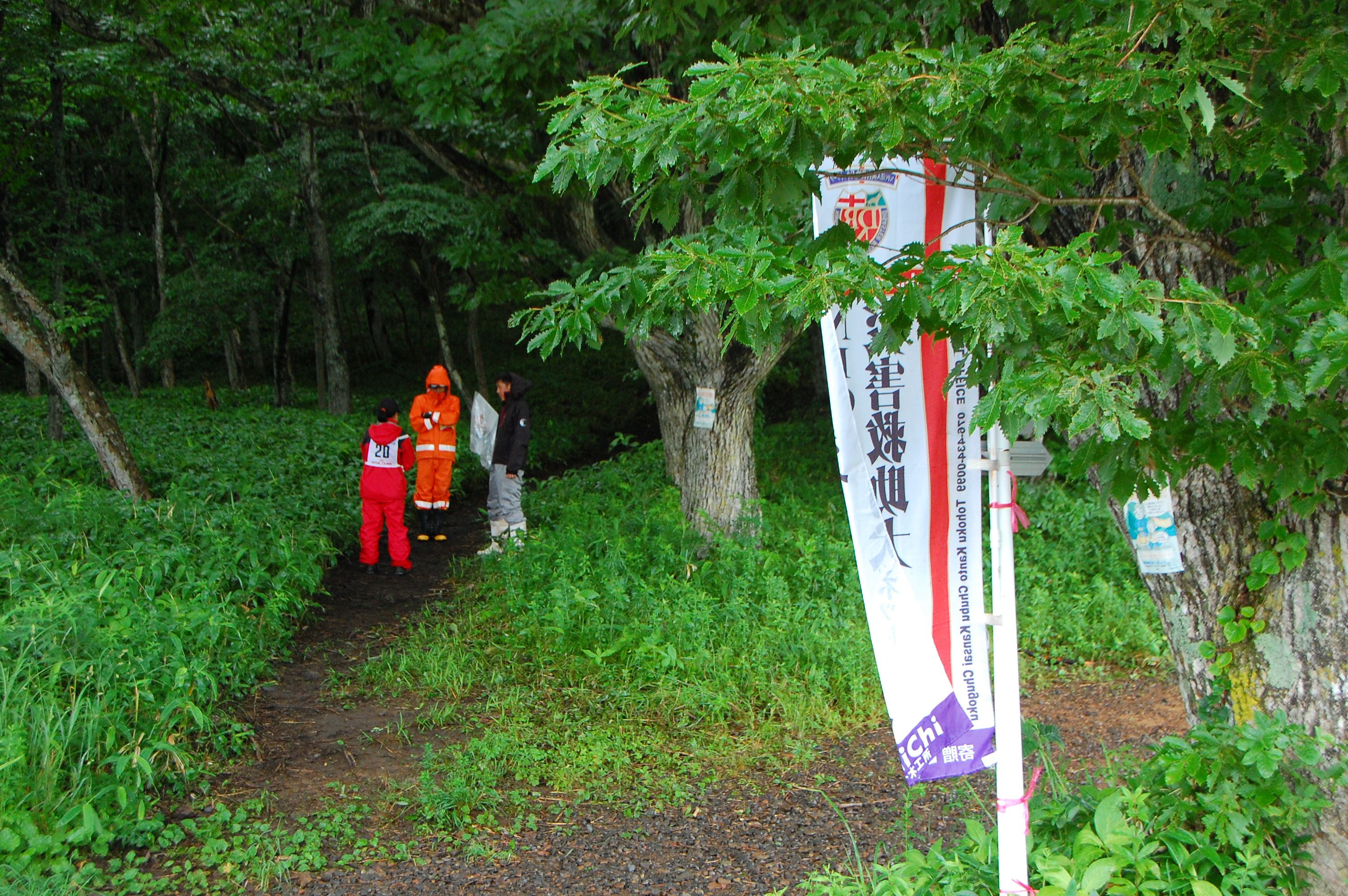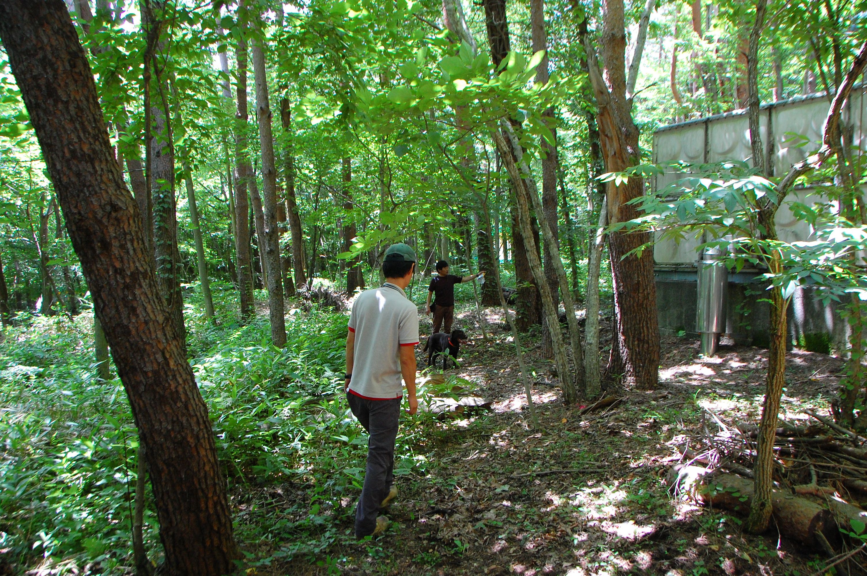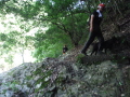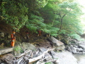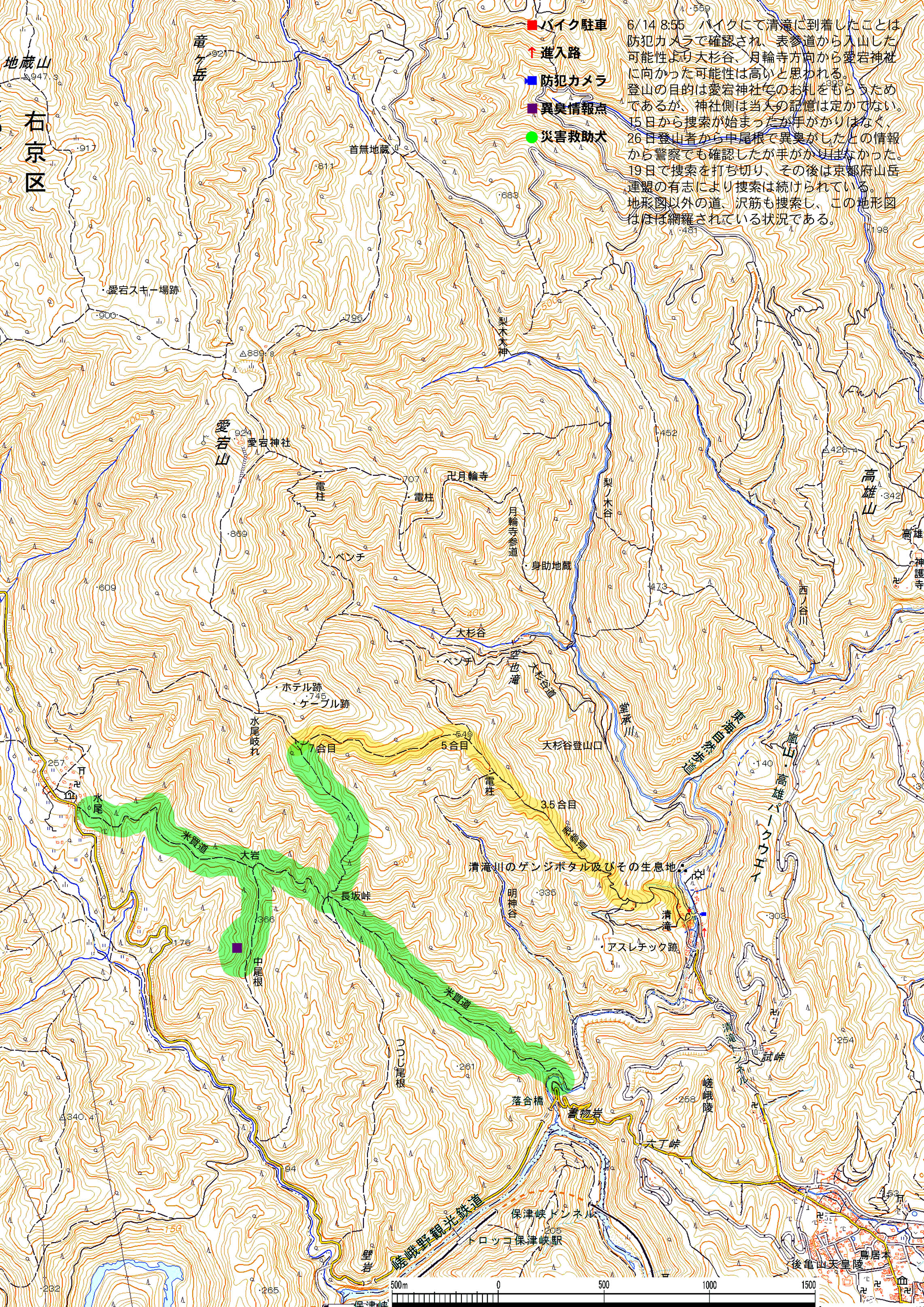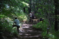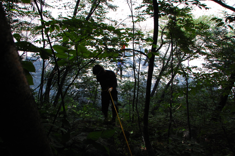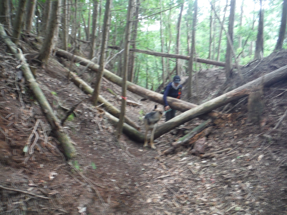 警察からの情報をもとに、京都府山岳連盟との連携で、当会は犬の特性を生かせるであろう南側の尾根筋、山岳会は北側の沢筋に分けて捜索を行った。時間の経過を考え必要と思われる作業準備を早朝に行い入山した。弁解になるが、当日は30度を超え、人犬ともに持続性、集中力を発揮できず、成果には結びつけられなかった。