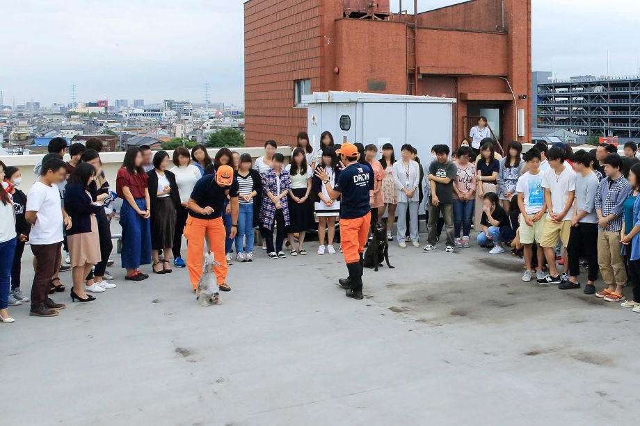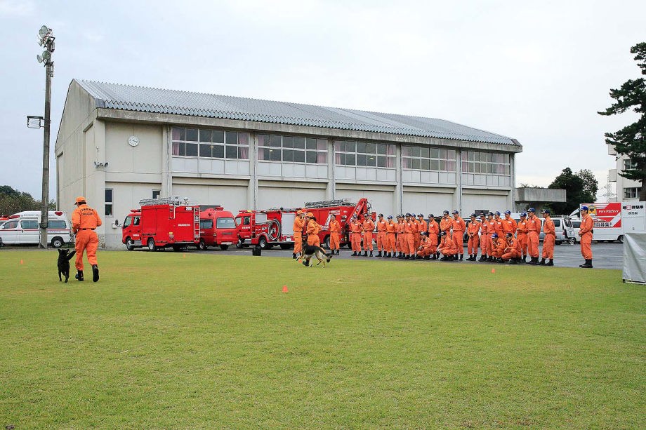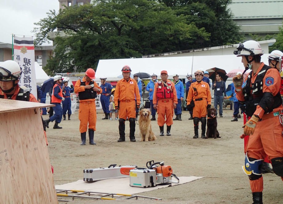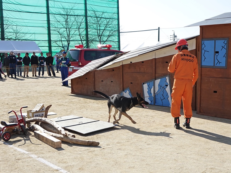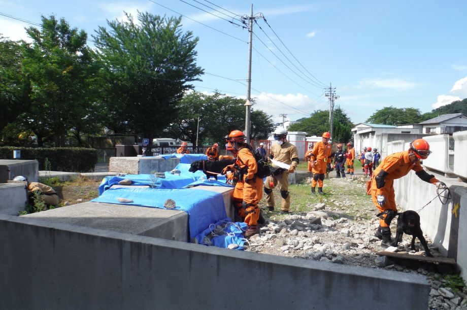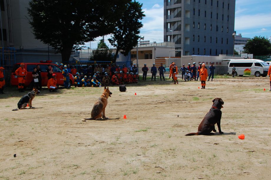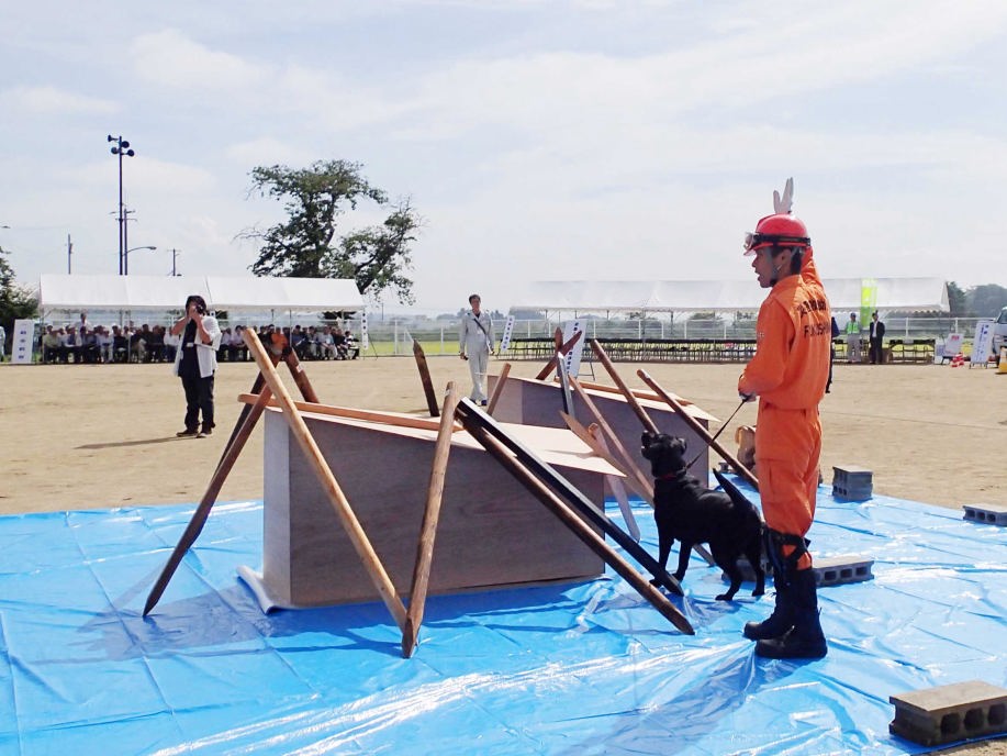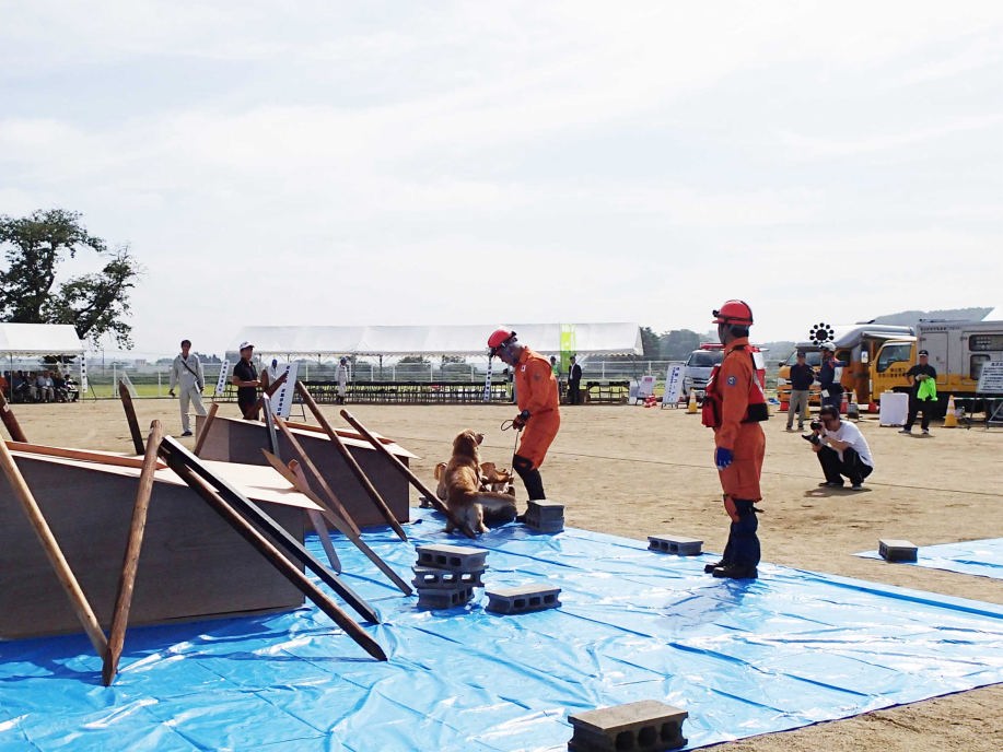 災害救助犬の特性が生かせる作業環境で効率的な人命救助の一翼を担うために、救助隊に災害救助犬の理解を深め、現場で連携した行方不明者の捜索を考えるためのデモンストレーション。