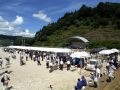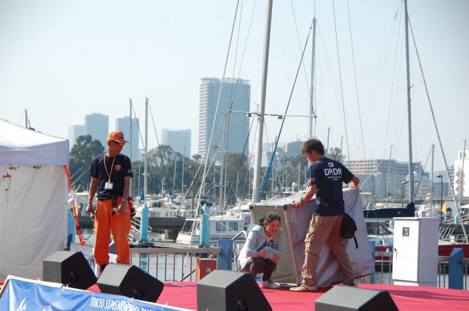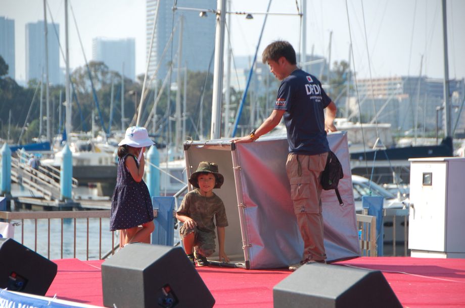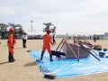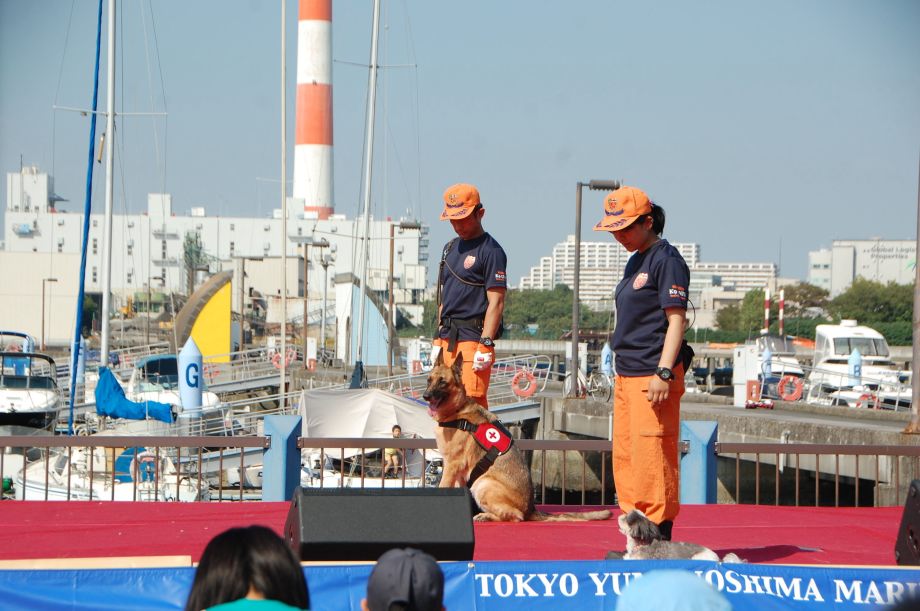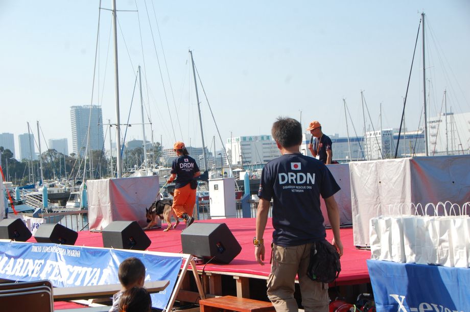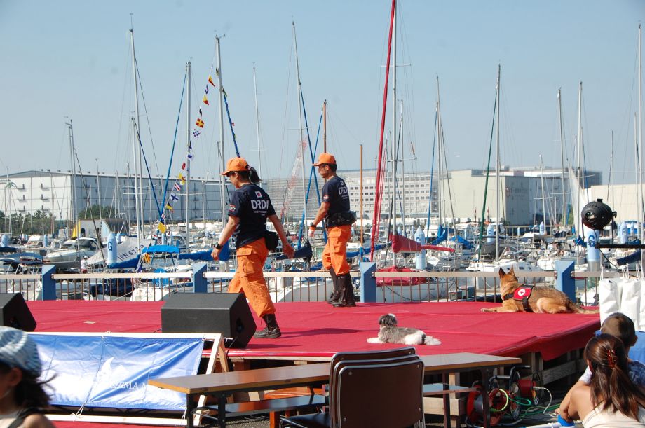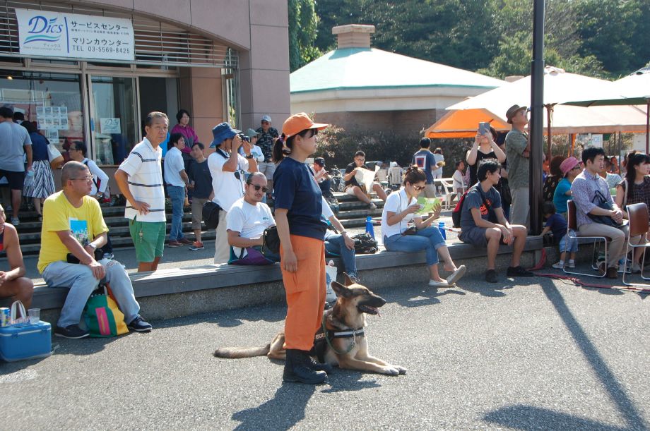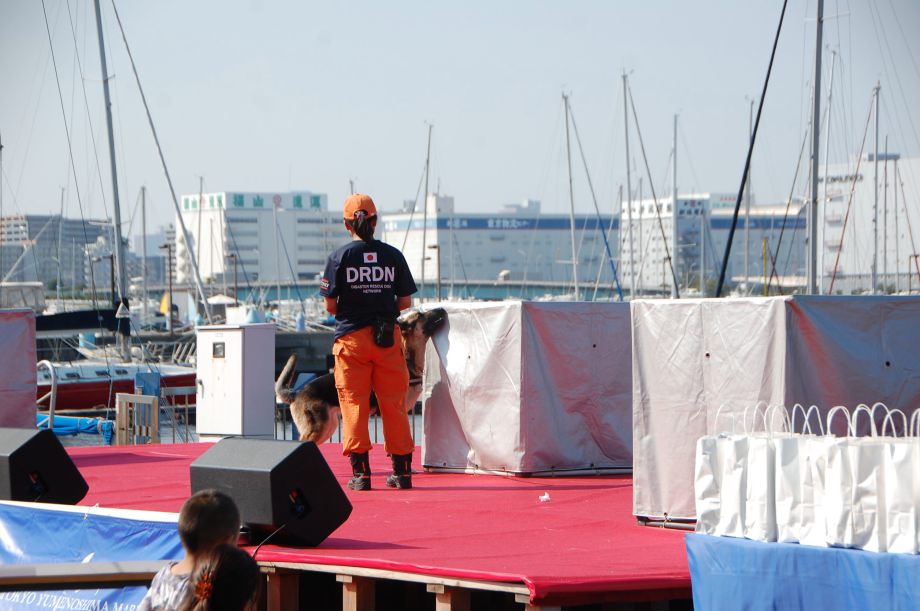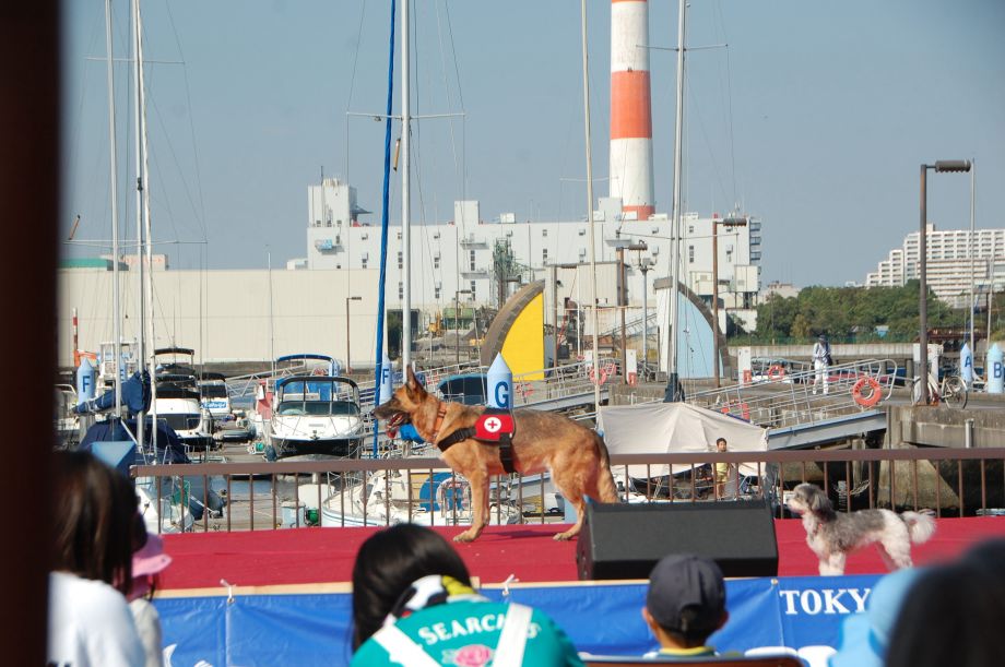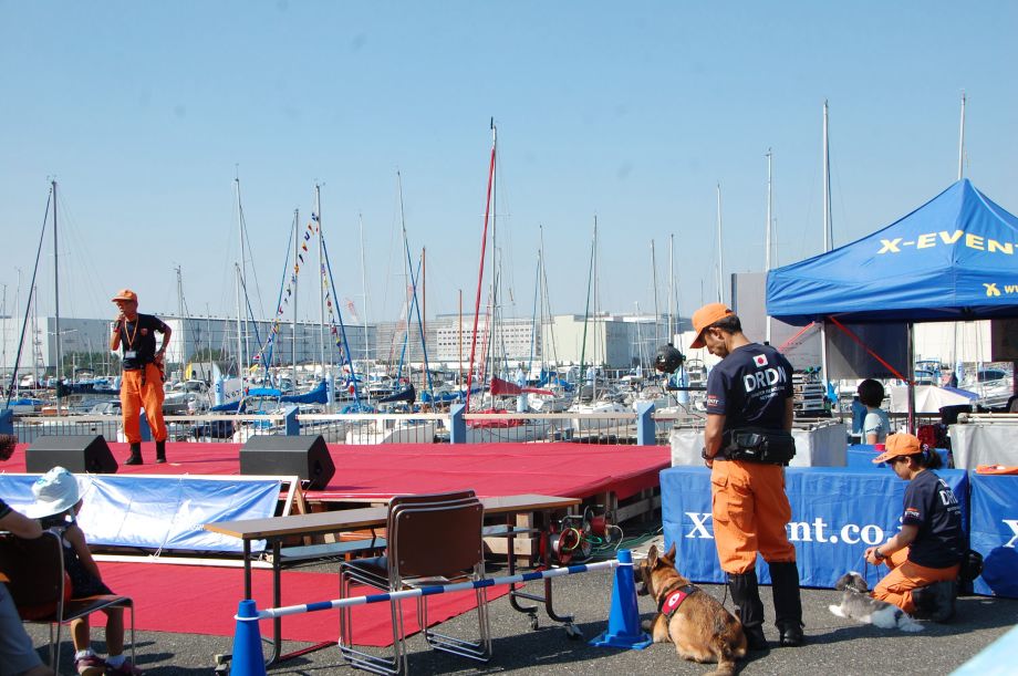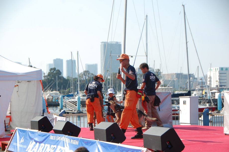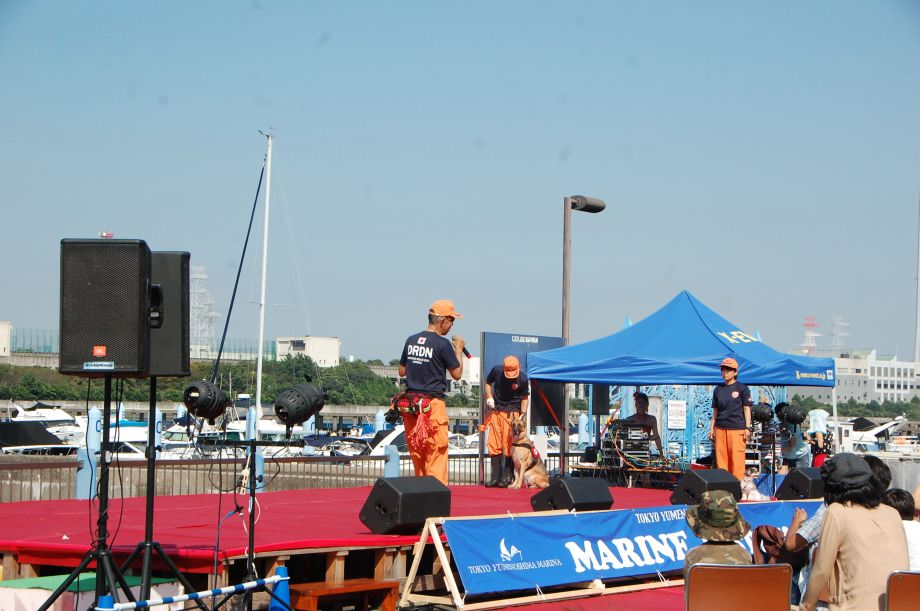 東京夢の島マリーナで毎年行われているイベントである。主に海辺をイメージしたステージの中に災害救助犬は不釣り合いかもしれない。が参加者は喜んでいただいた印象である。この日は暑く犬たちは大変であったがシェパードと小型犬を並べて服従作業を見せたが、同じように作業をする小型犬には拍手が多かった。広報の活動として行っているがデモを通じて災害救助犬に興味が湧いてもらえばありがたい。