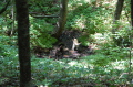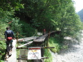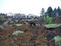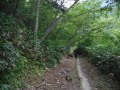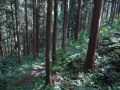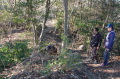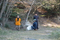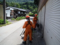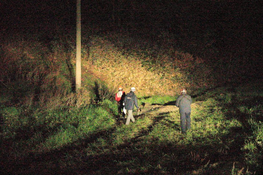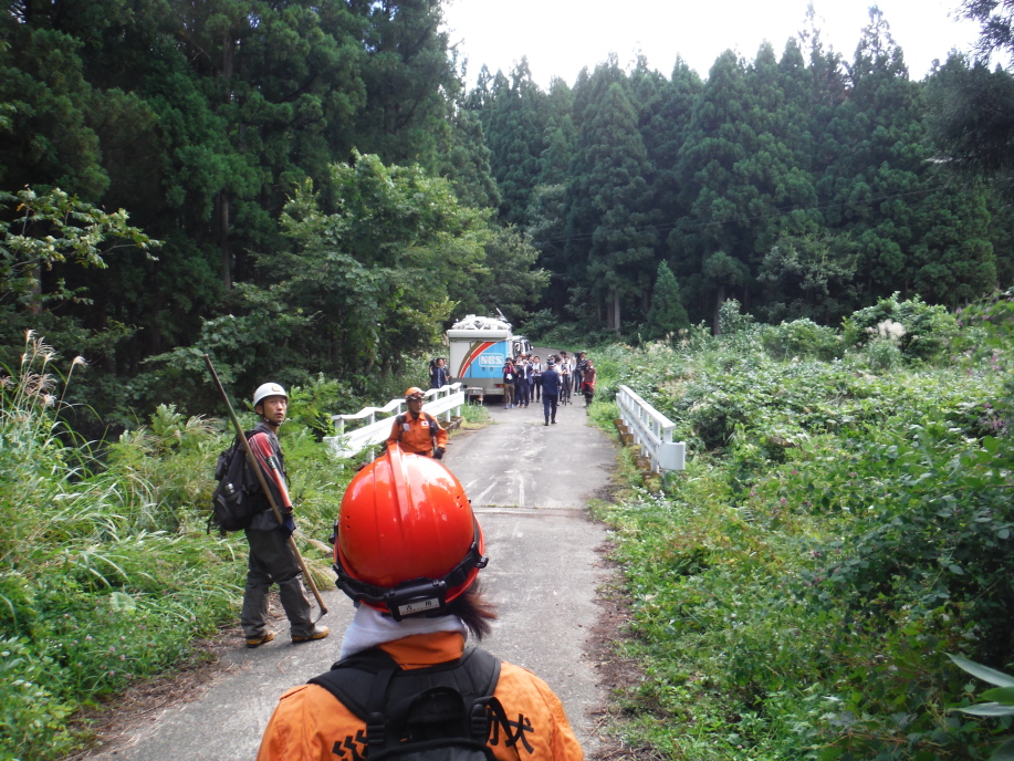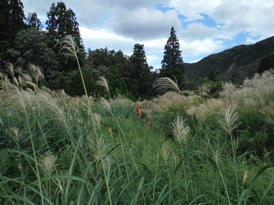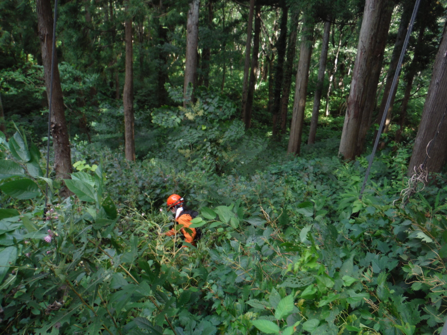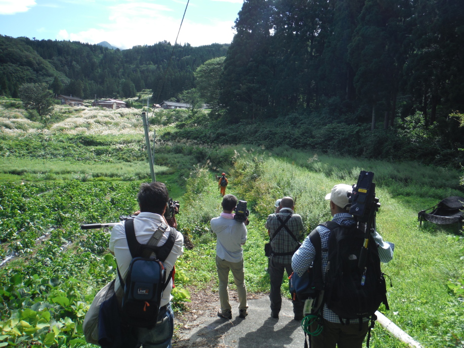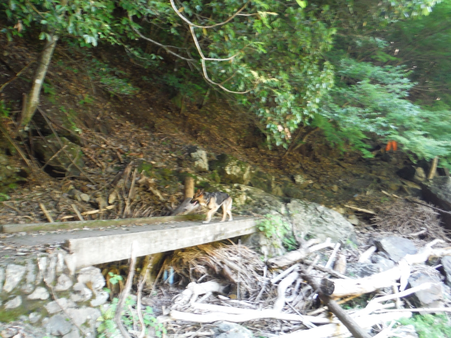 災害救助犬は、2名の地元消防団員のサポートで救助隊とは別行動となり、無暗に藪に入らずサンダル発見場所の橋から林道沿いに浮遊臭を取らせ僅かな変化でも確認するようにした。しかし、藪は深く蔓が絡みついて犬たちは動きづらそうである。天候もよく気温も上昇してきた。そして後方にはマスコミが張り付いてきて一言一句、一挙手一投足に気を遣う。そのうえ周囲には救助隊が捜索しており、その臭いに引っ張られている感じであったこともあり、子供の声を聞いたという笹野地区に移った。ここも棚田であった場所も荒れて2mほどの藪である。風は舞っている感じで周囲からの臭いはとれるみたいで、犬は時折見せる反応の先にはマスコミか救助隊がいた。
