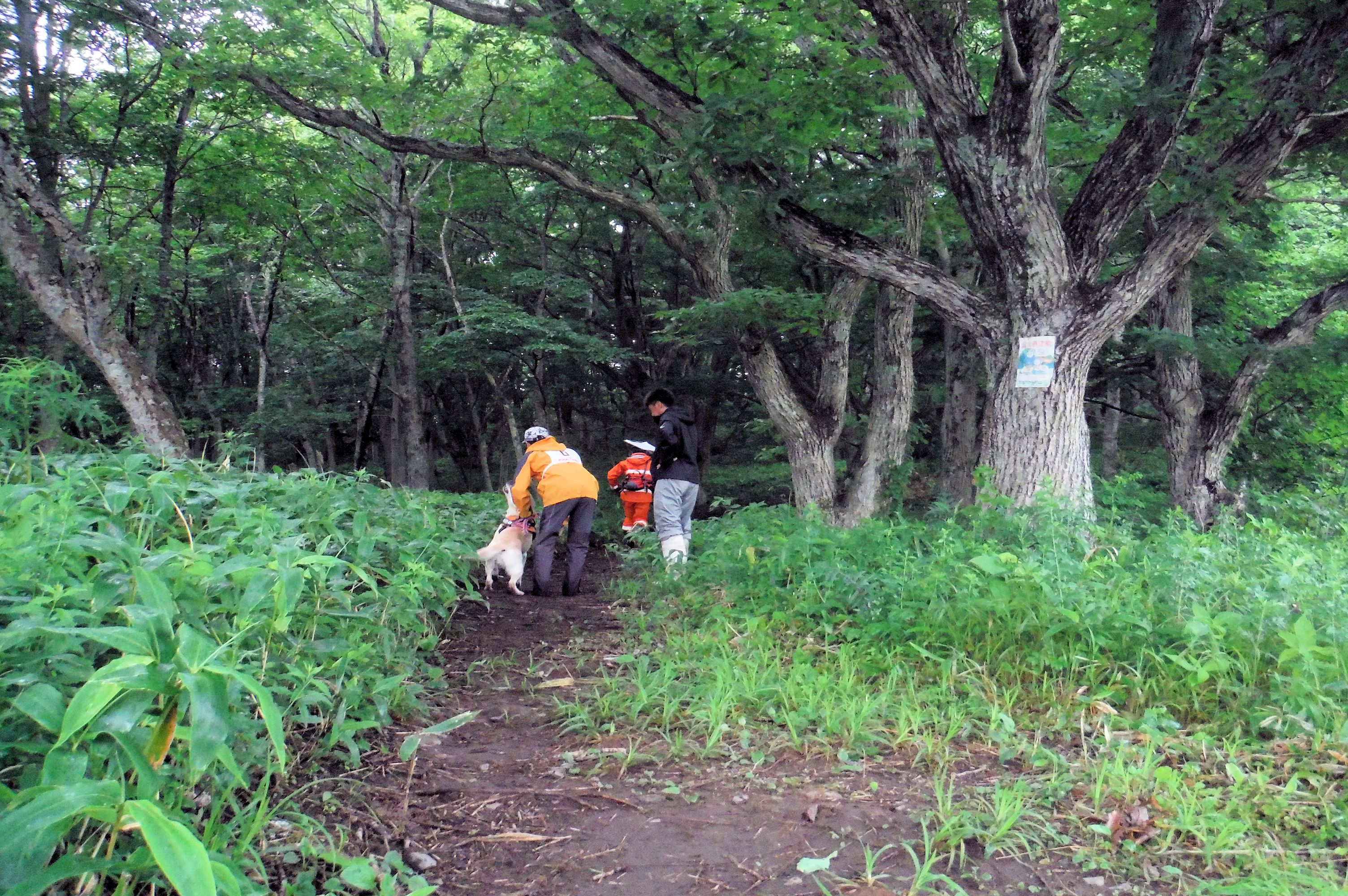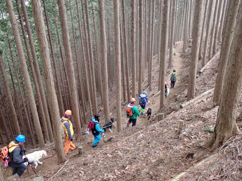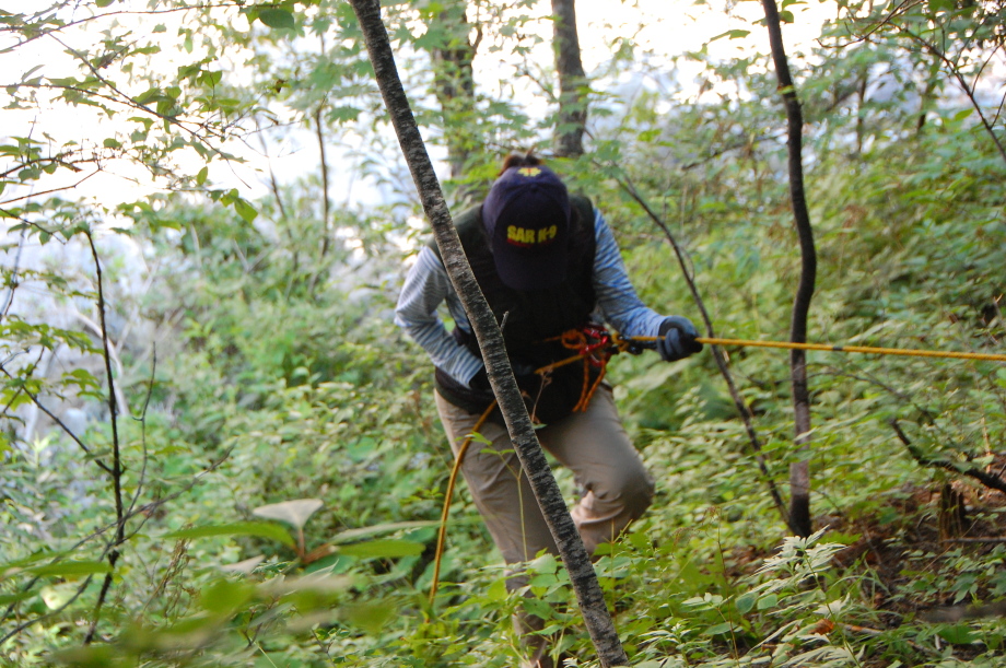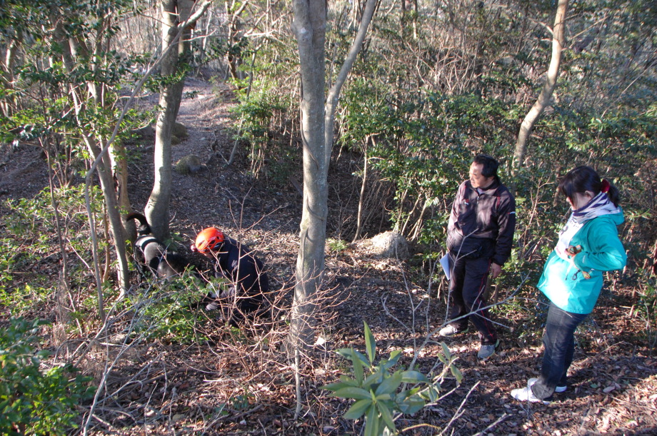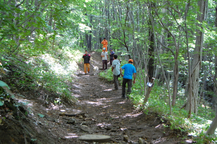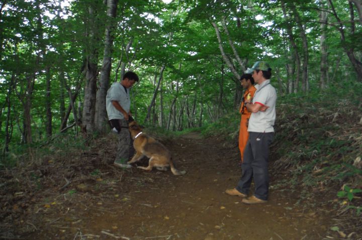 現実は災害よりも行方不明者の依頼の機会は多いので真剣に取り組む必要がある。山岳地での地図の読み方、現在地の確認、自己の安全確保などは身につけておかなければならない。そのためのレクチャーを行ったうえで、登山道を歩きながら要救助者の捜索訓練に入った。広いエリアで微細な犬の反応を読み取るのは難しいので、当会ではハンドラーのサポーターはペアで動くするようにしている。