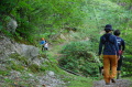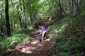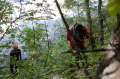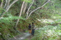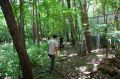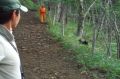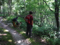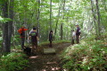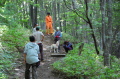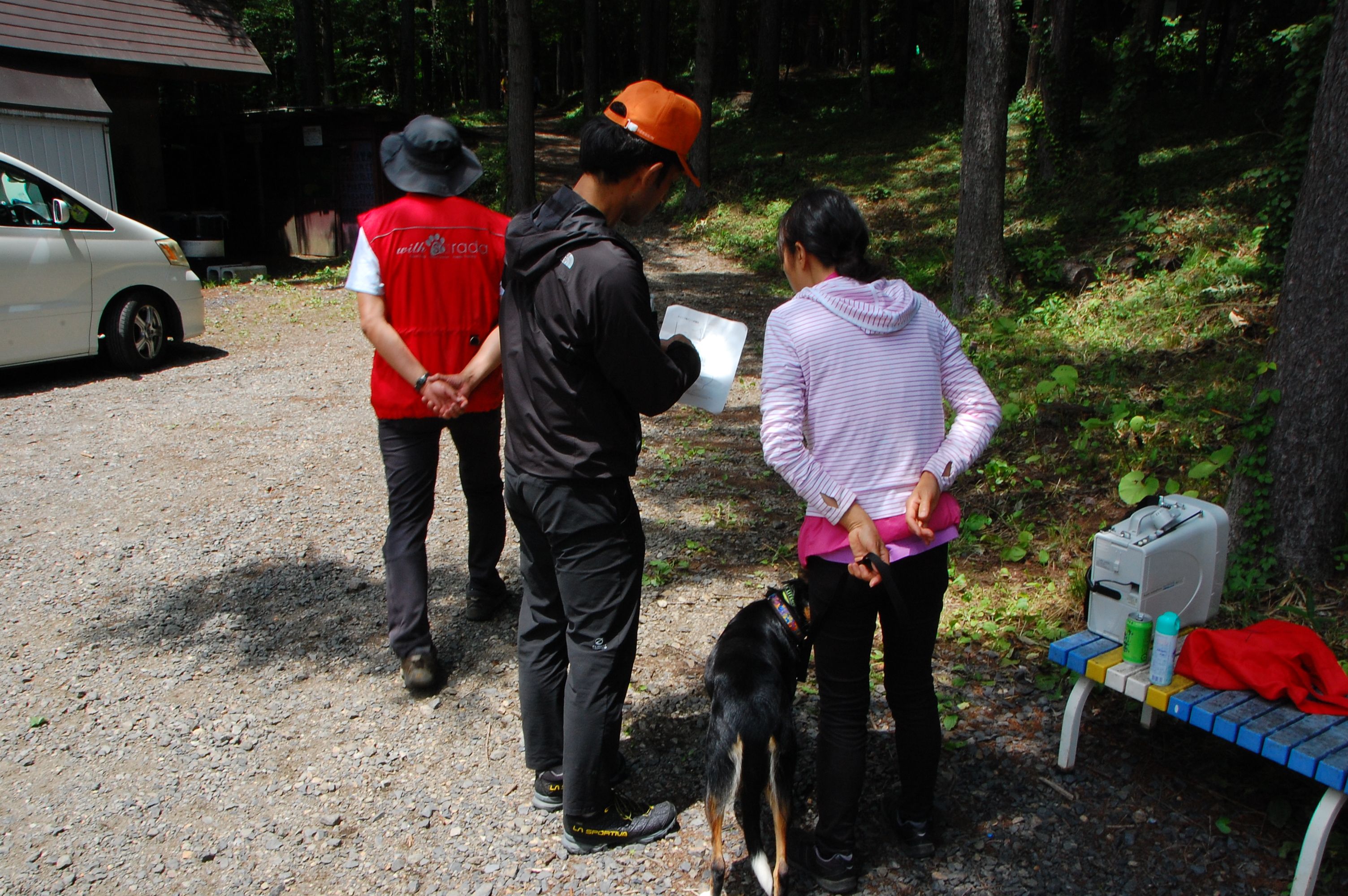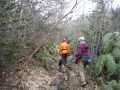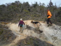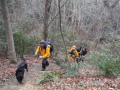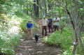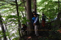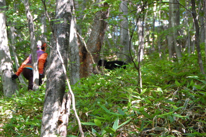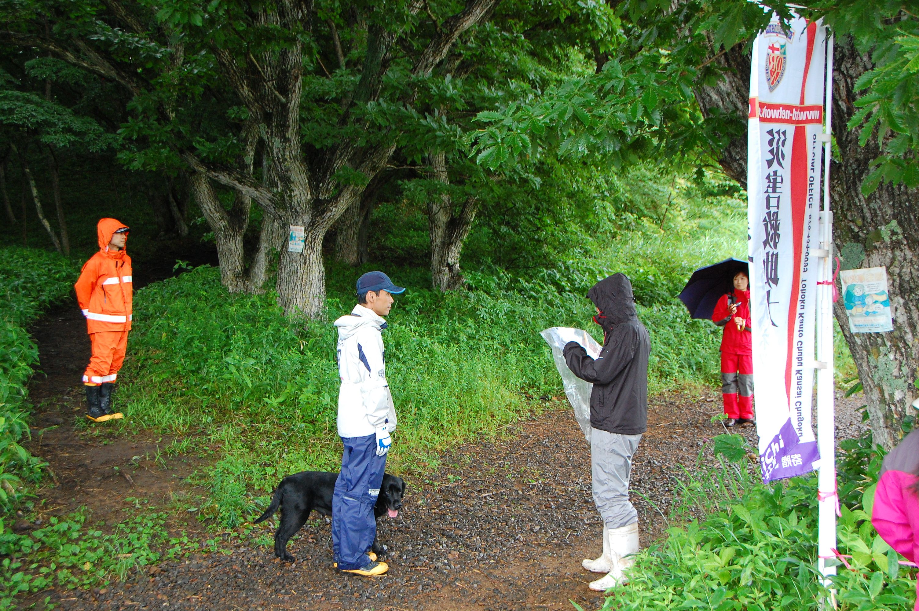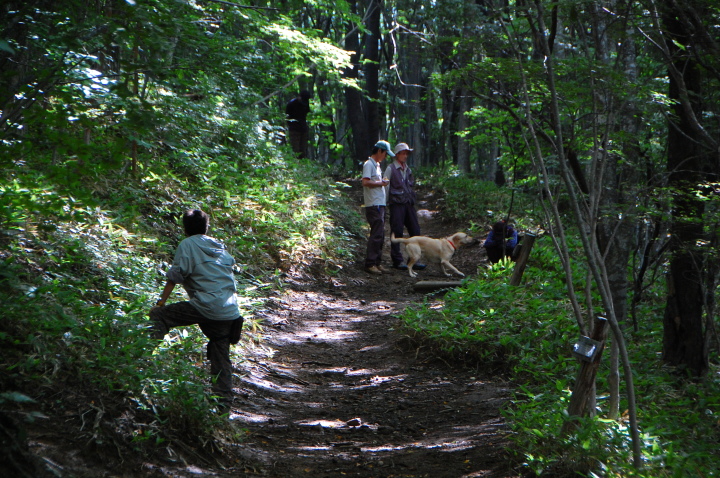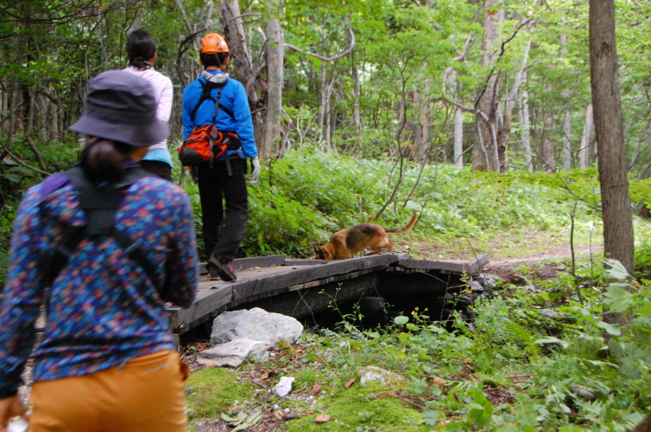 現実は災害よりも行方不明者の依頼の機会は多いので真剣に取り組む必要がある。山岳地での地図の読み方、現在地の確認、自己の安全確保などは身につけておかなければならない。そのためのレクチャーを行ったうえで、登山道を歩きながら要救助者の捜索訓練に入った。広いエリアで微細な犬の反応を読み取るのは難しいので、当会ではハンドラーのサポーターはペアで動くするようにしている。