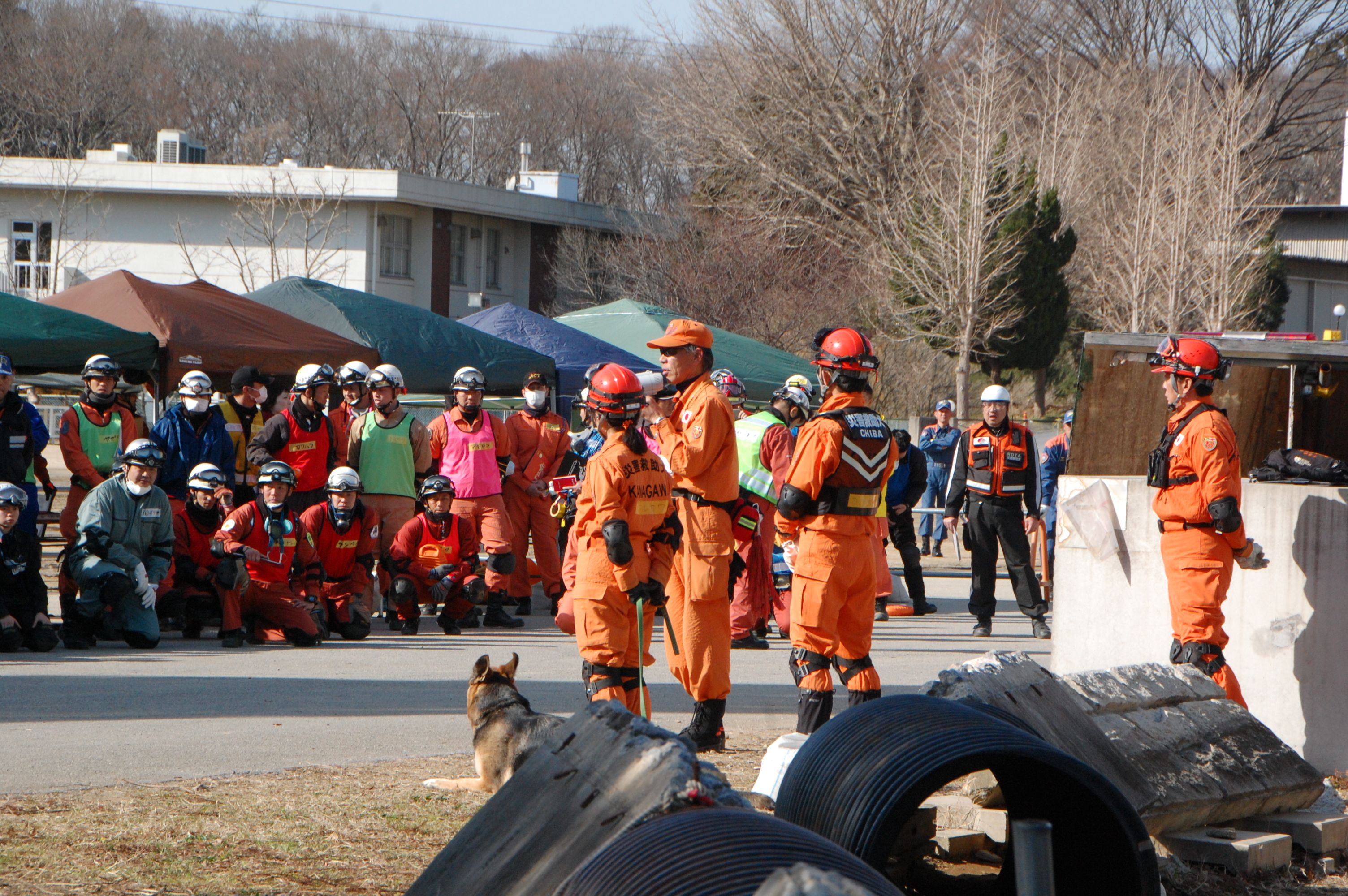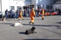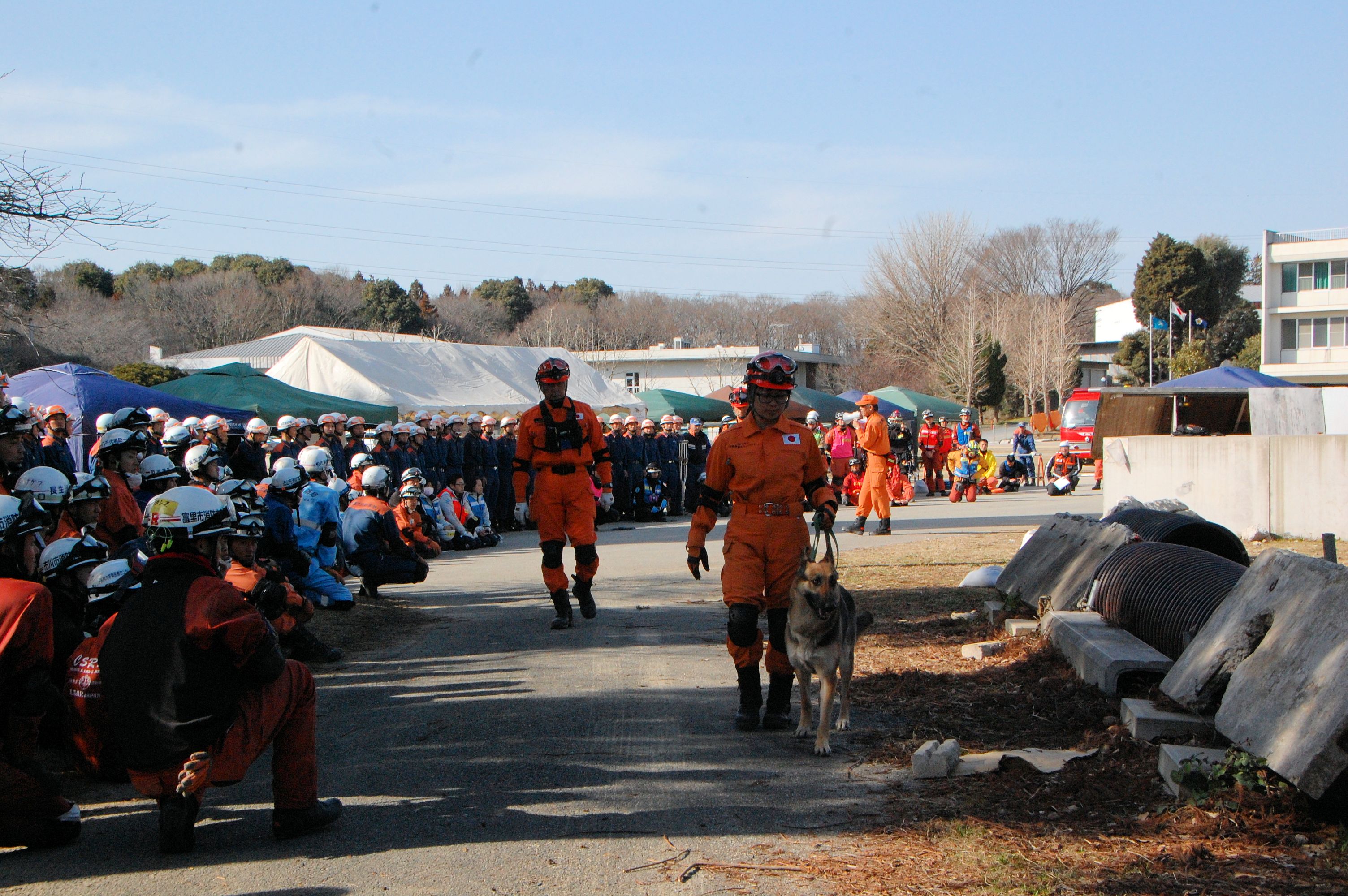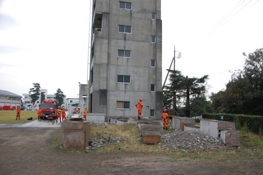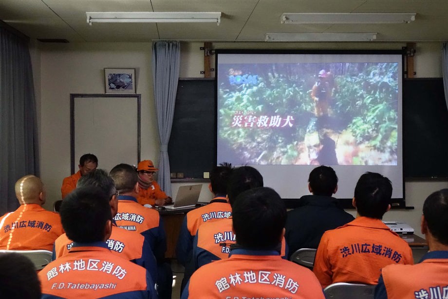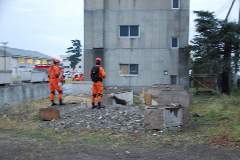 そのために、80名程の参加者と消防学校の学生100名程を前に、災害救助犬の特性、活用方法の提案、連携上の注意点などについて10分間デモを行った。発見捜索ばかりでなく、ゼロ回答において効率的な消防の救助活動に活用できる点、生存者がいた場合の発見率の精度を実際の現場で見てもらった。その評価はこれからである。