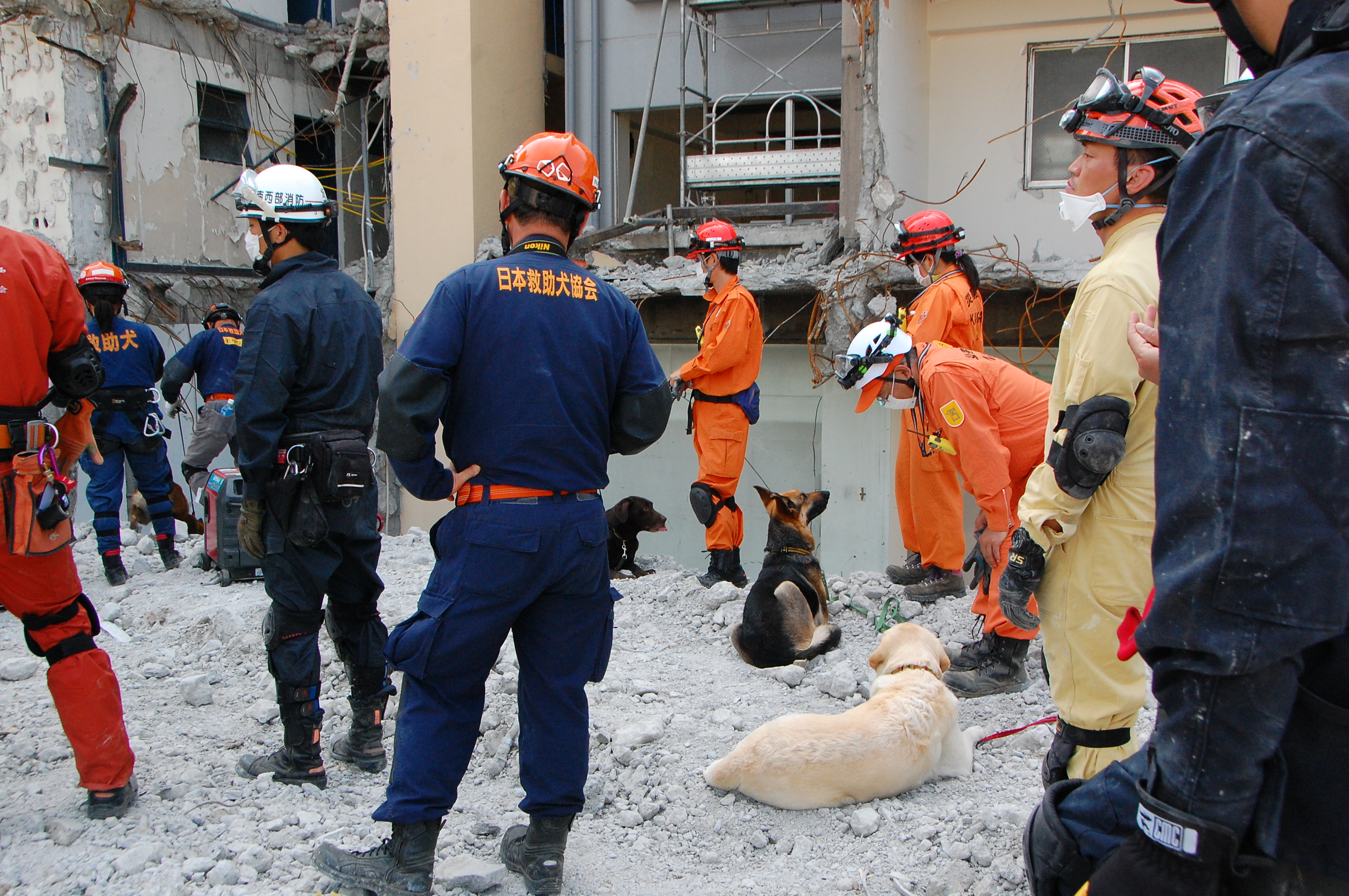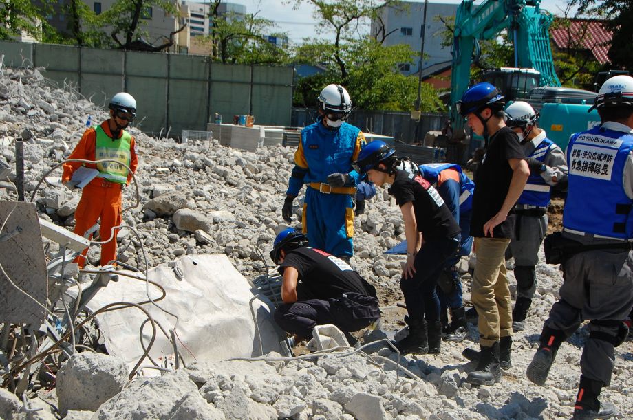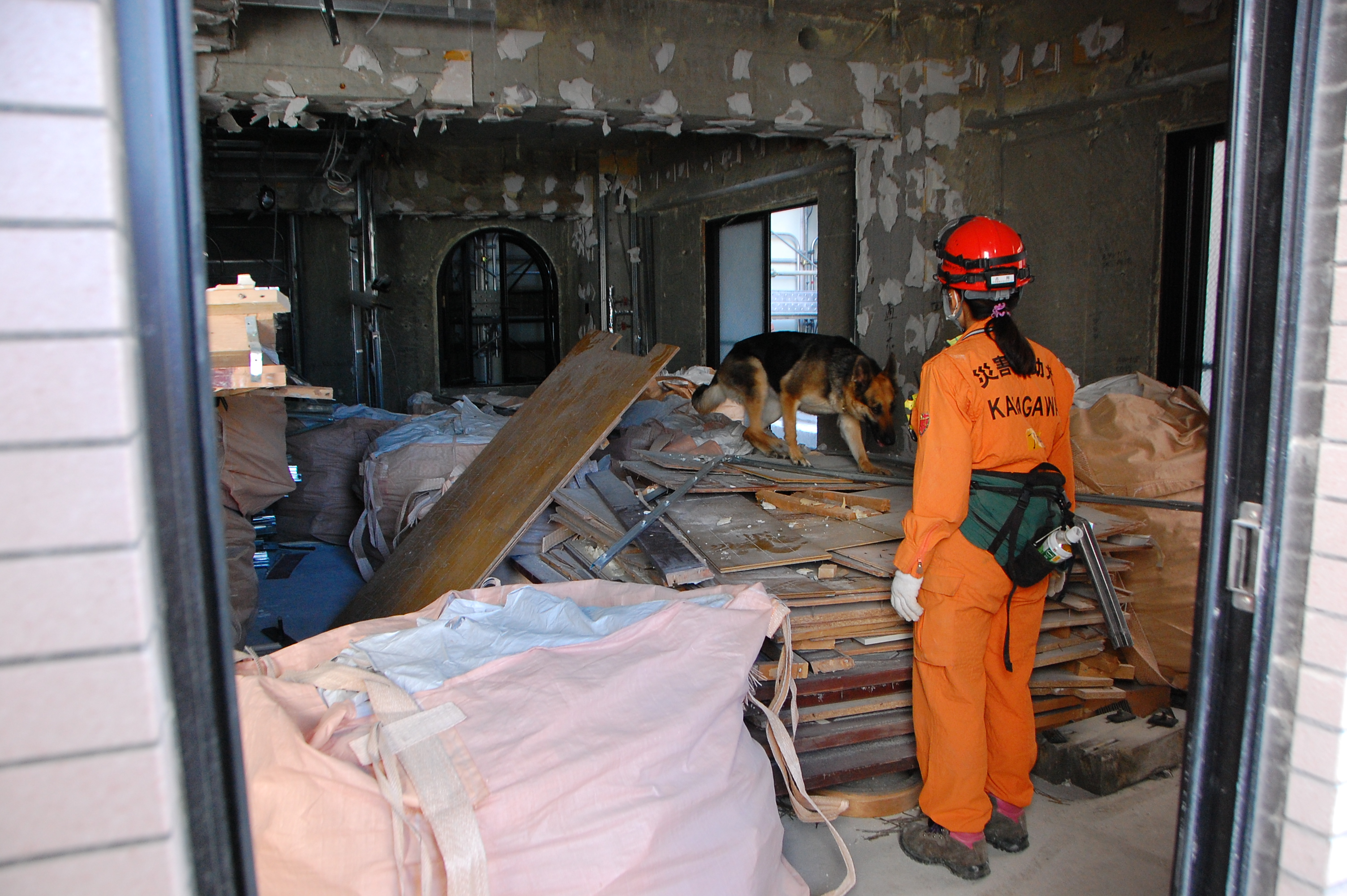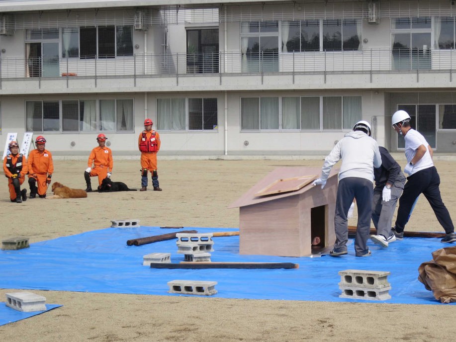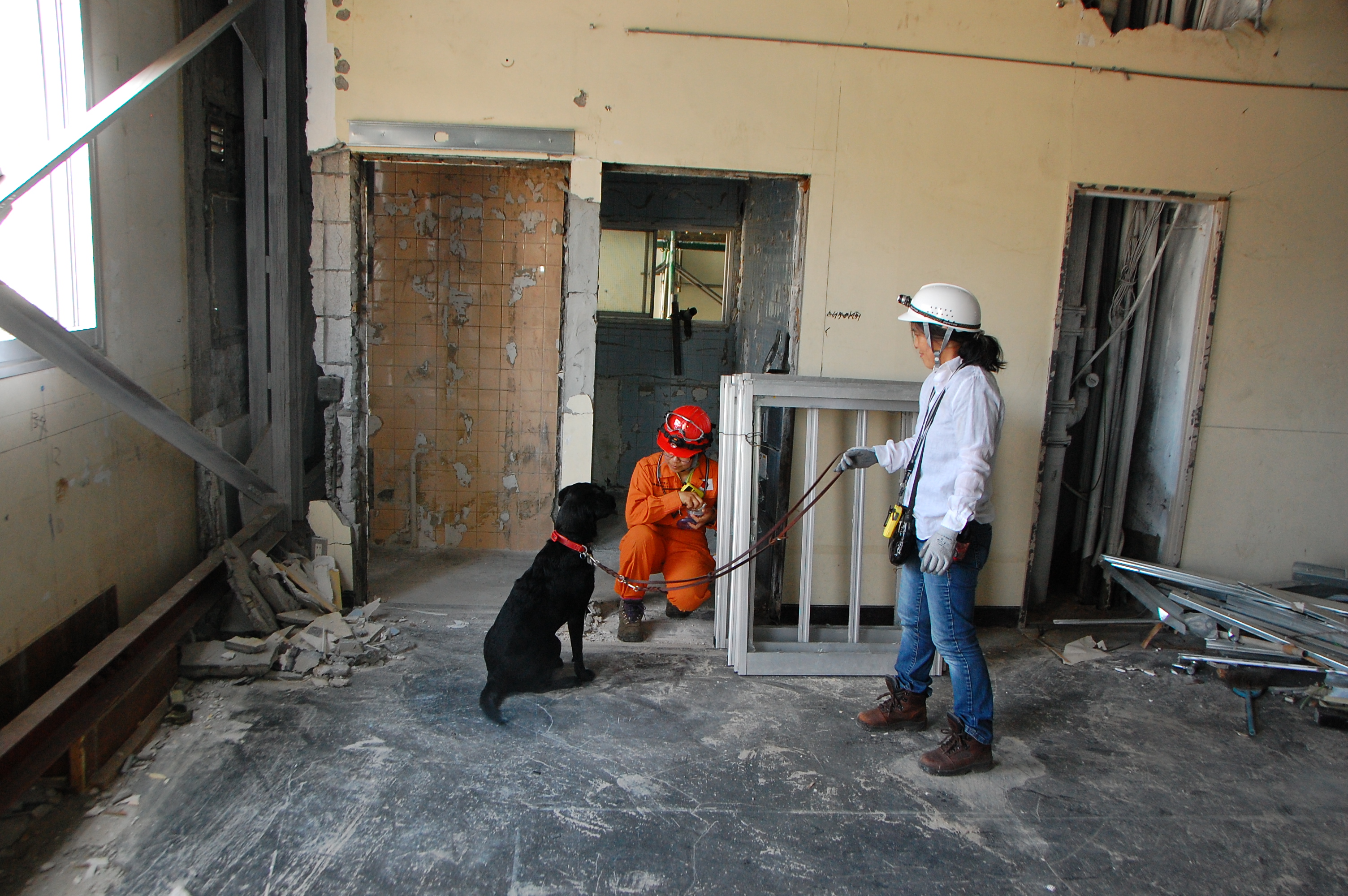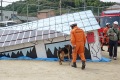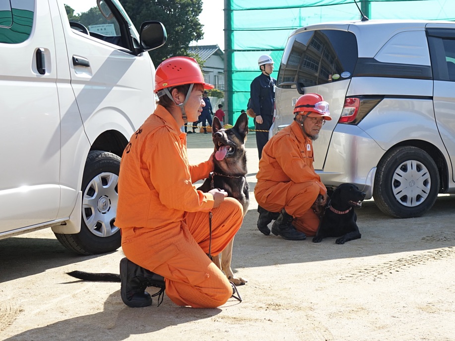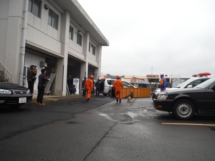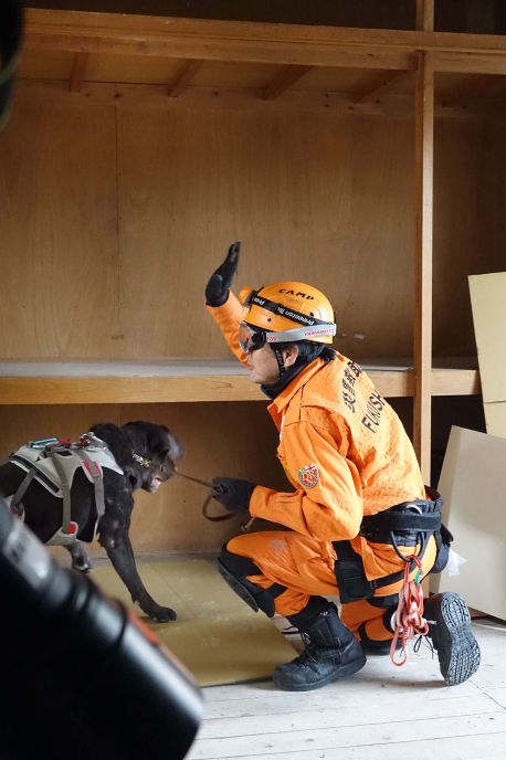 災害救助犬チームは安全管理者、隊長、ハンドラー2、災害救助犬2頭で倒壊家屋の行方不明者を捜索した。