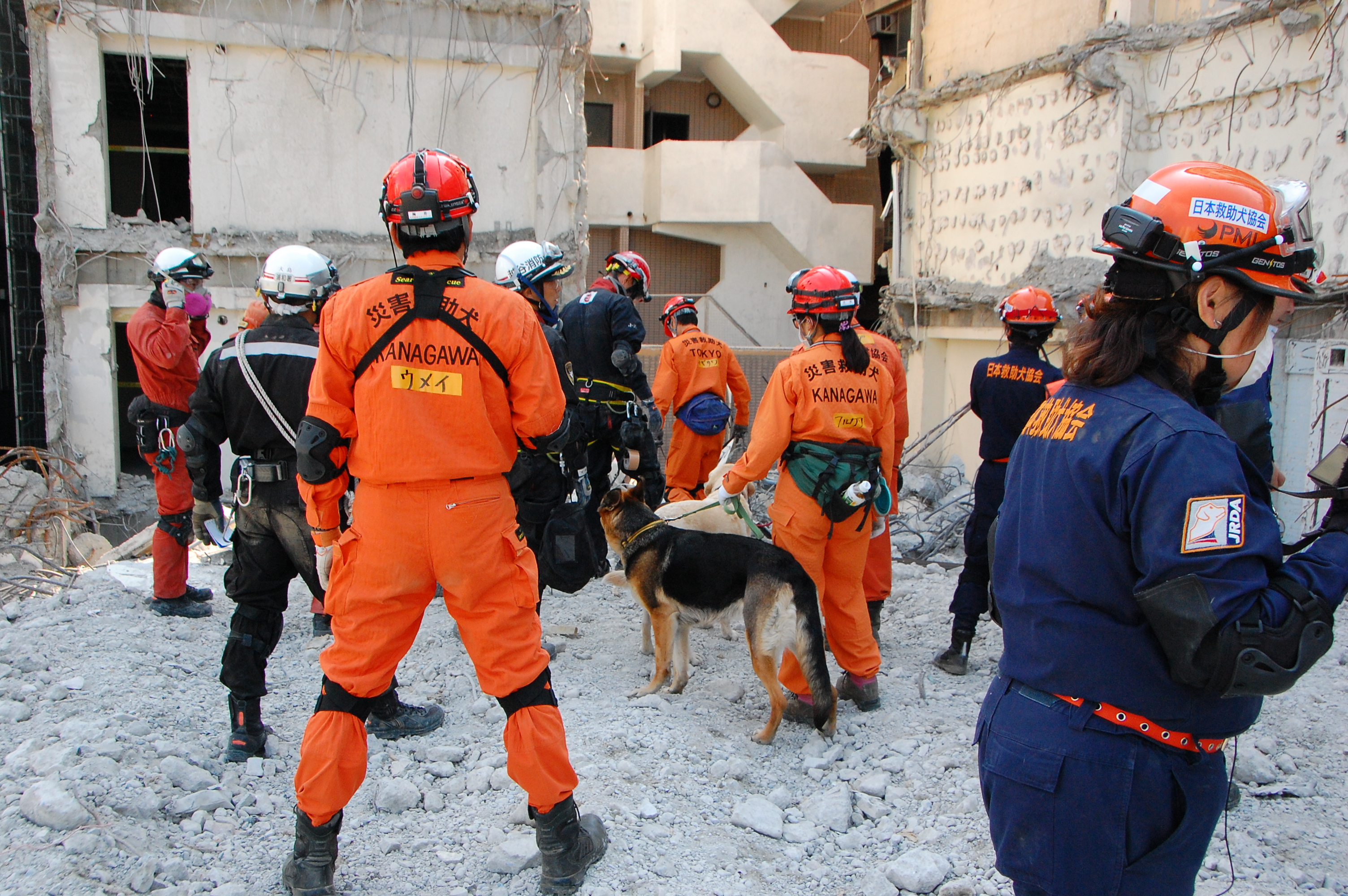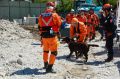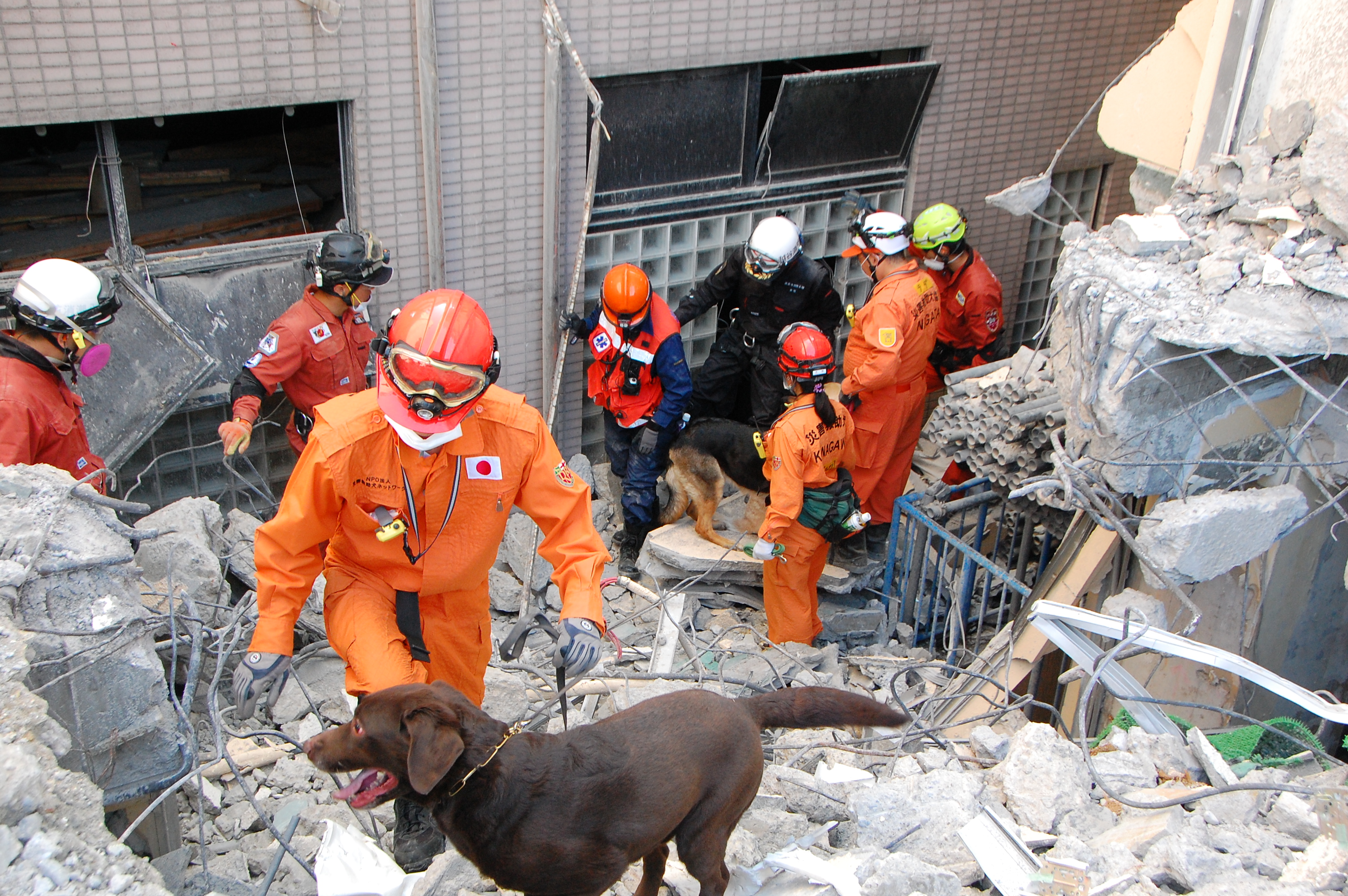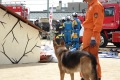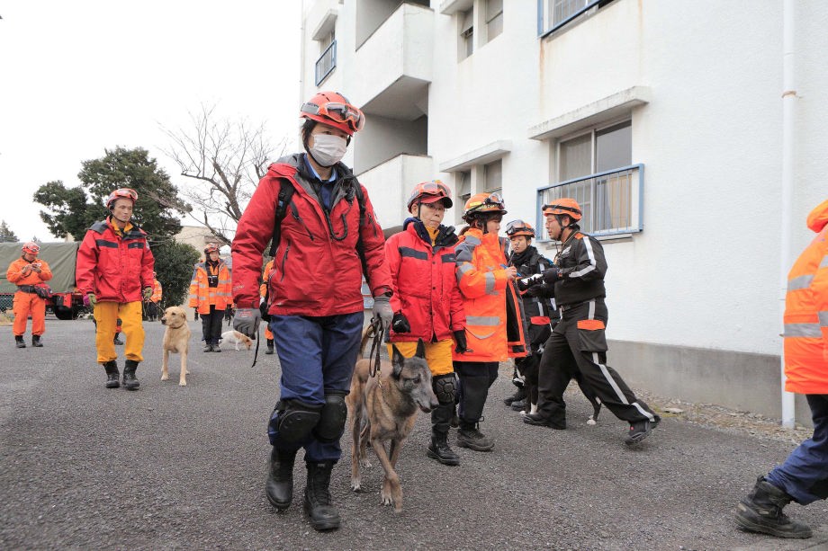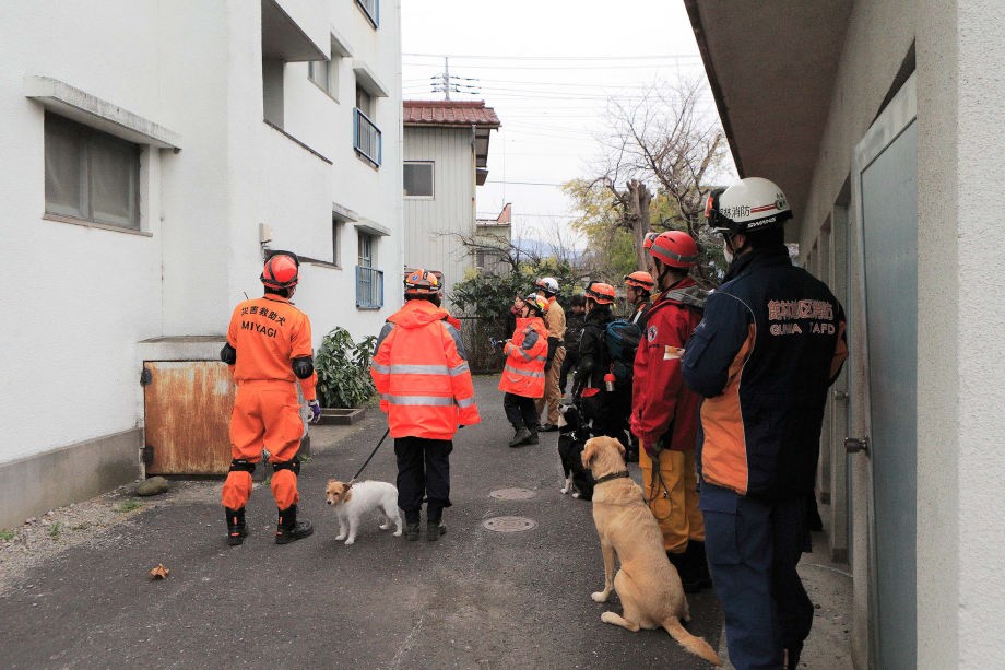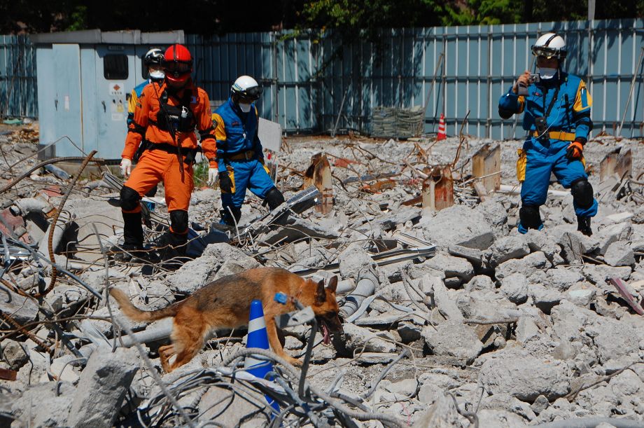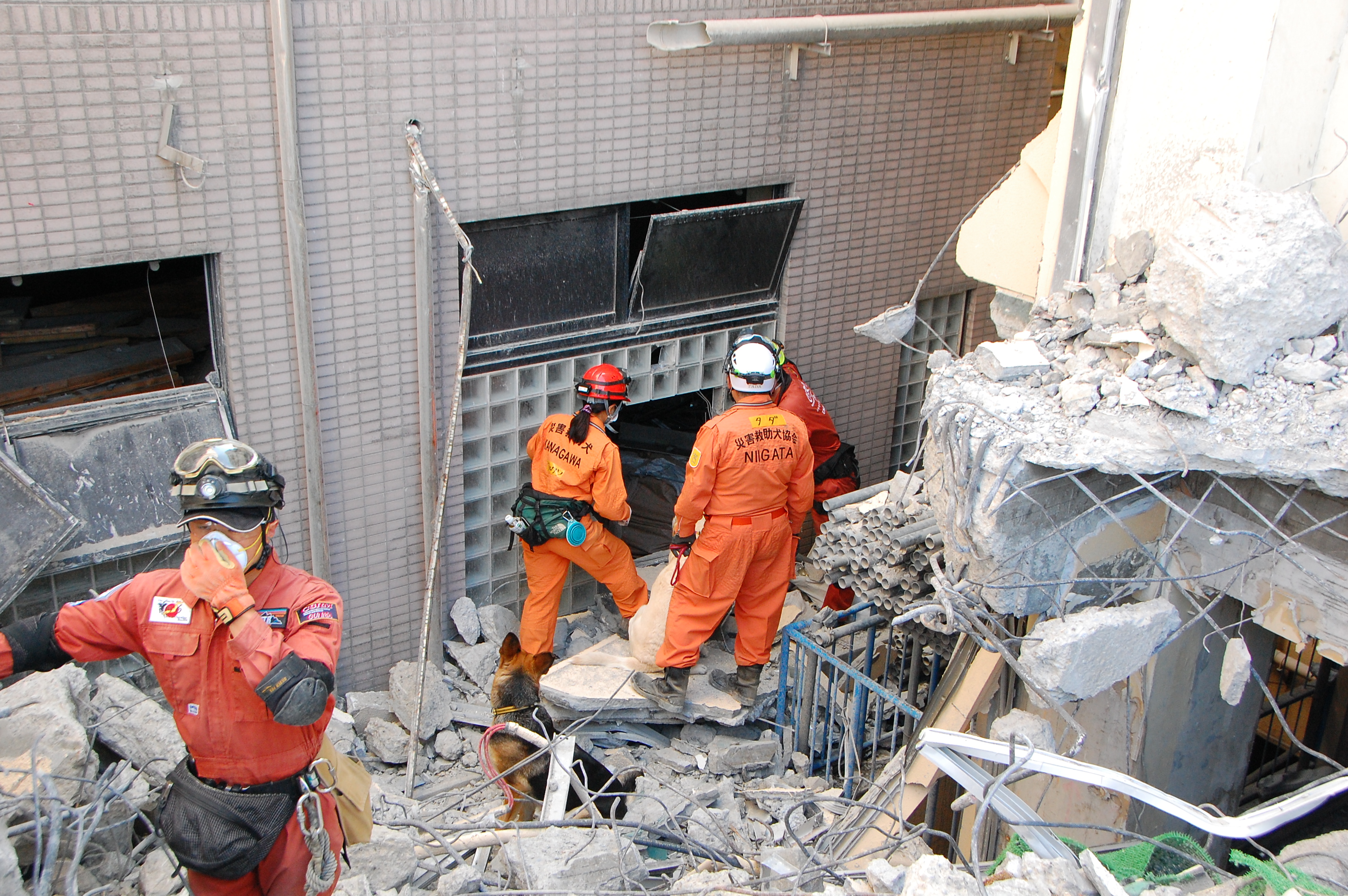 災害救助犬チームは安全管理者、隊長、ハンドラー2、災害救助犬2頭で倒壊家屋の行方不明者を捜索した。