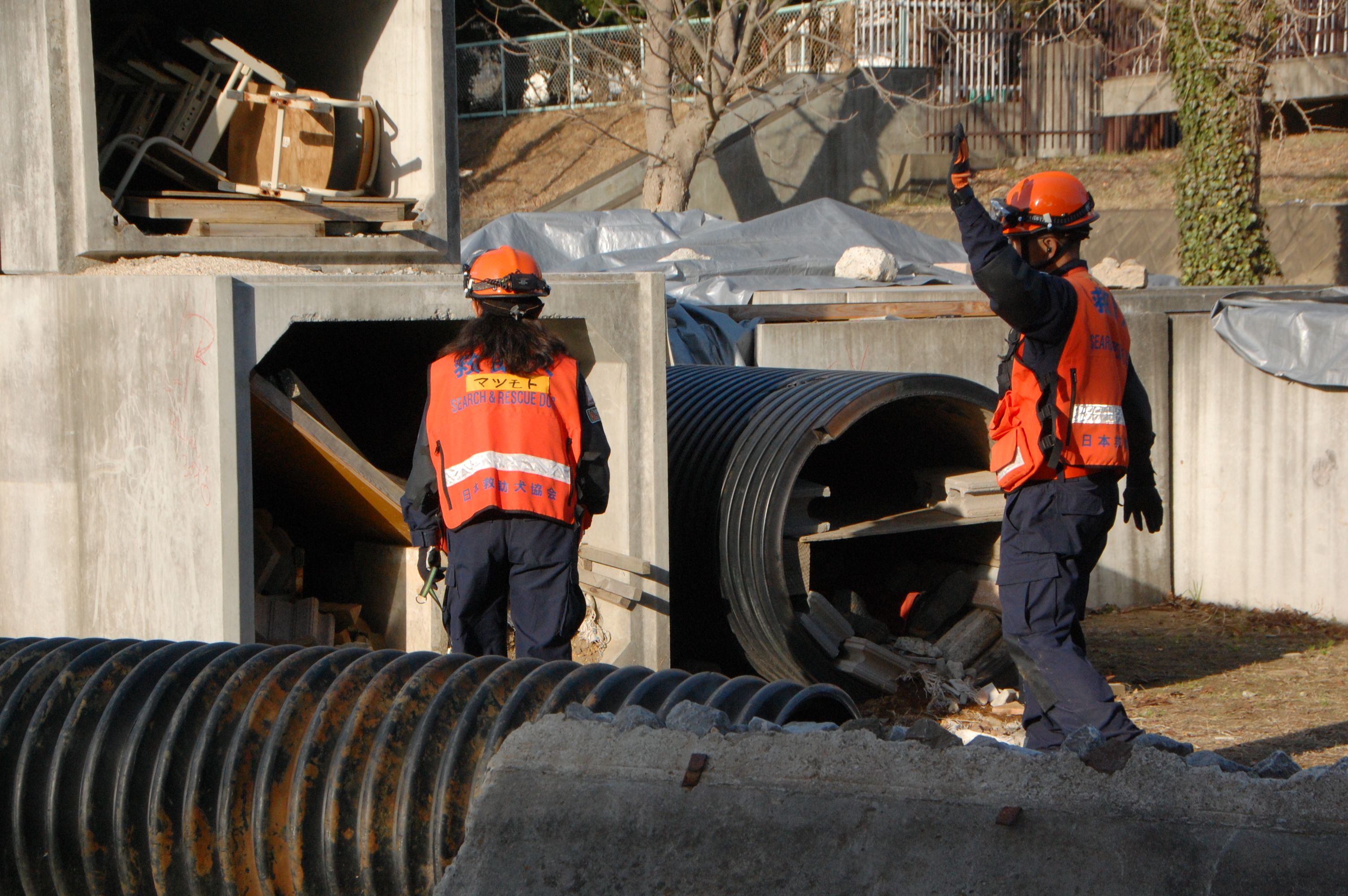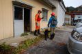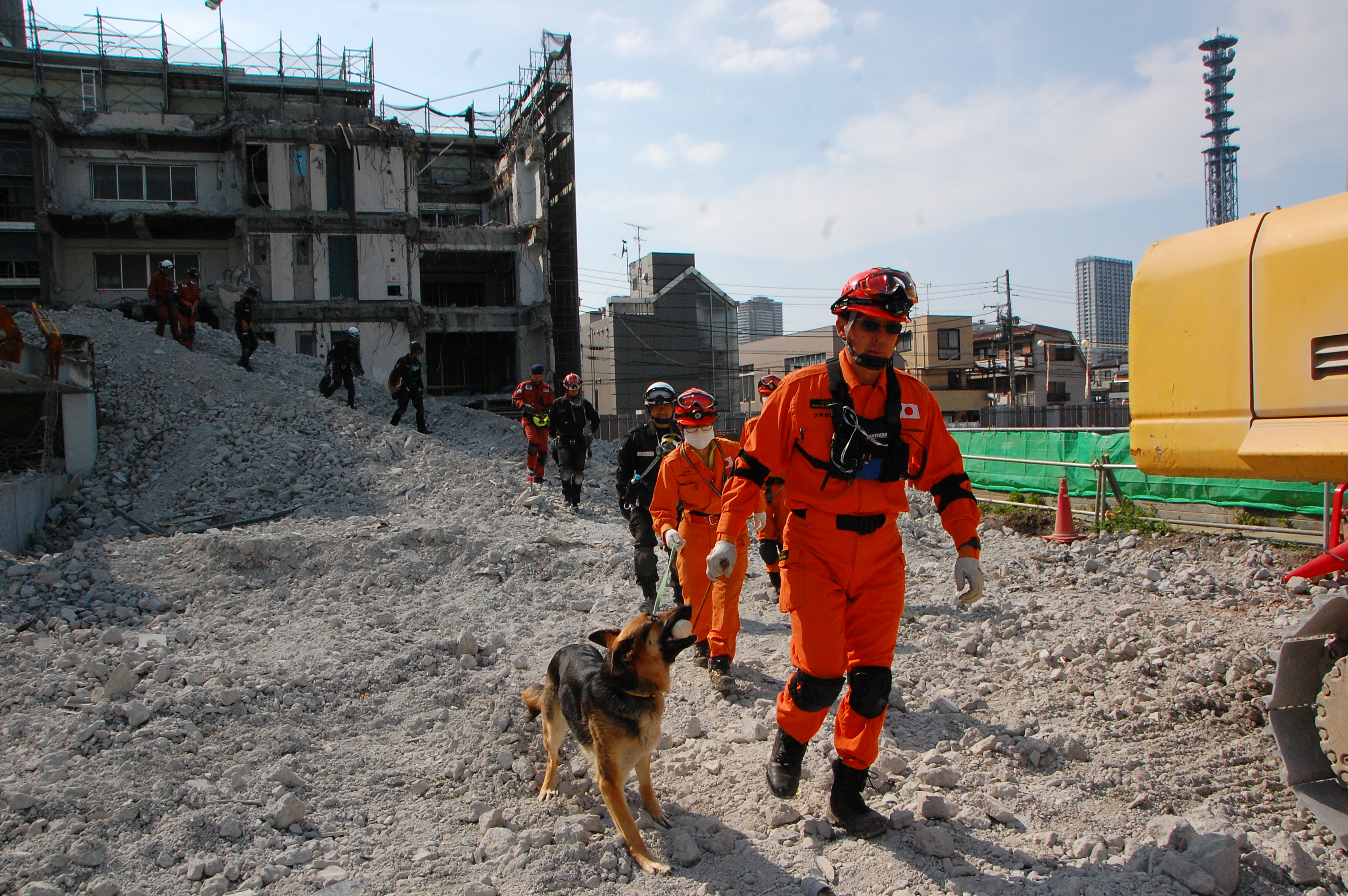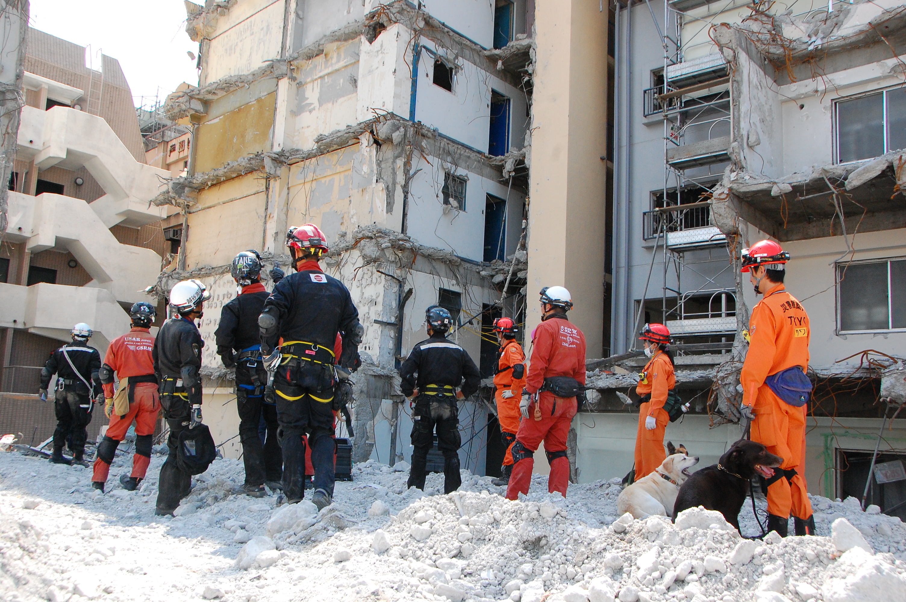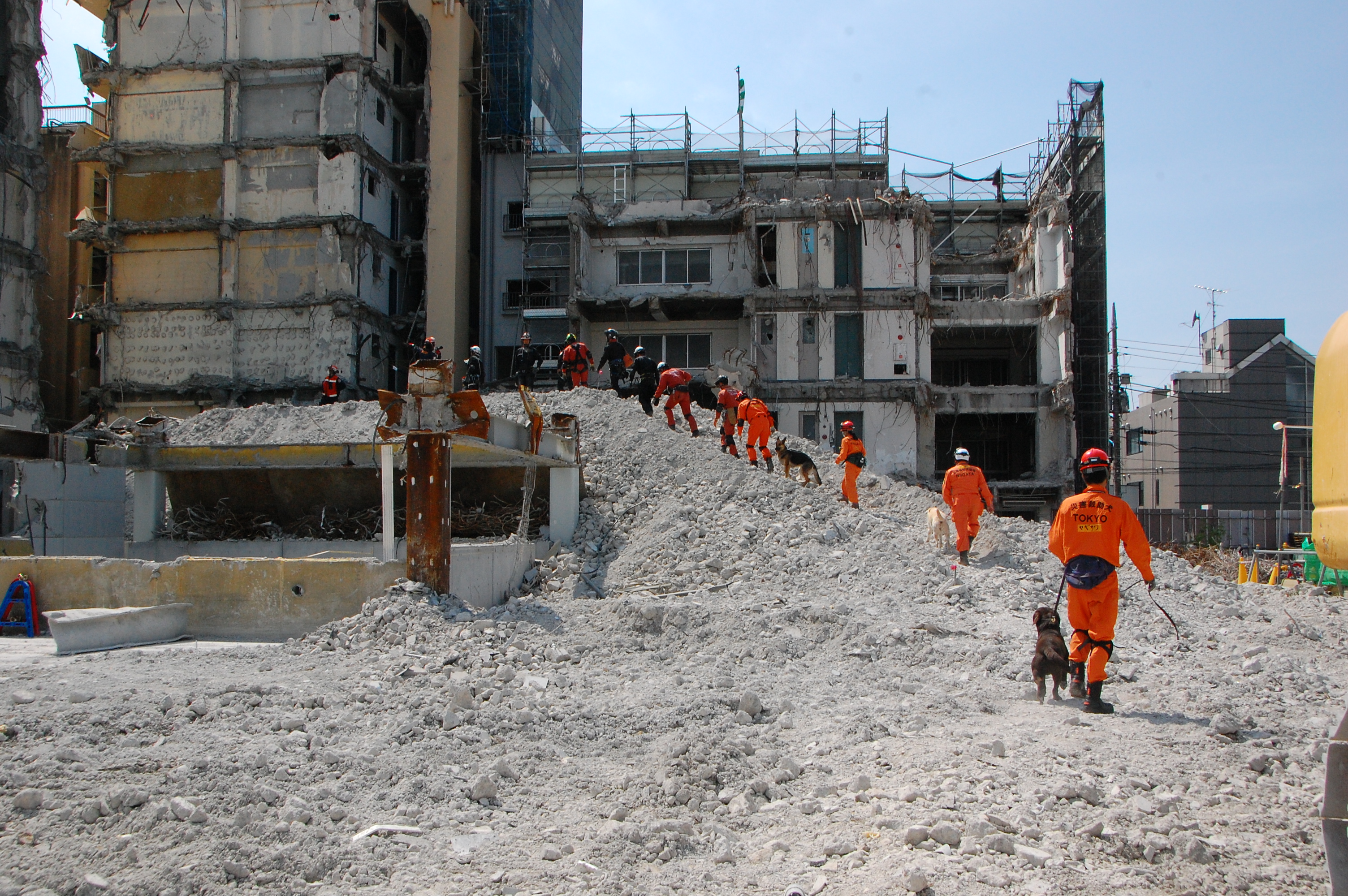 災害救助犬チームは安全管理者、隊長、ハンドラー2、災害救助犬2頭で倒壊家屋の行方不明者を捜索した。