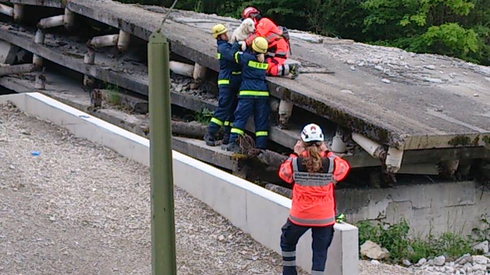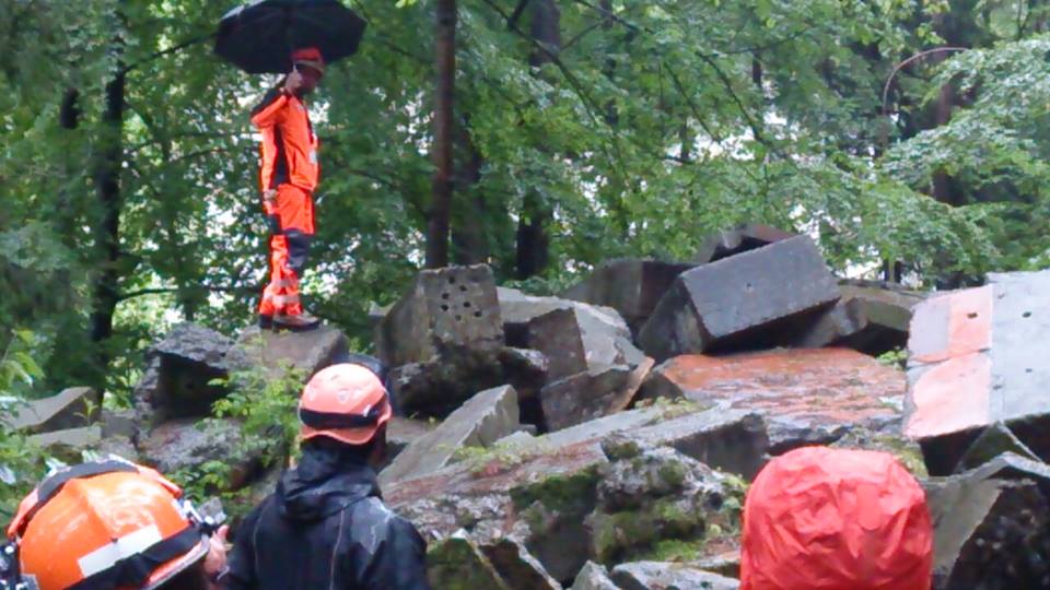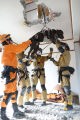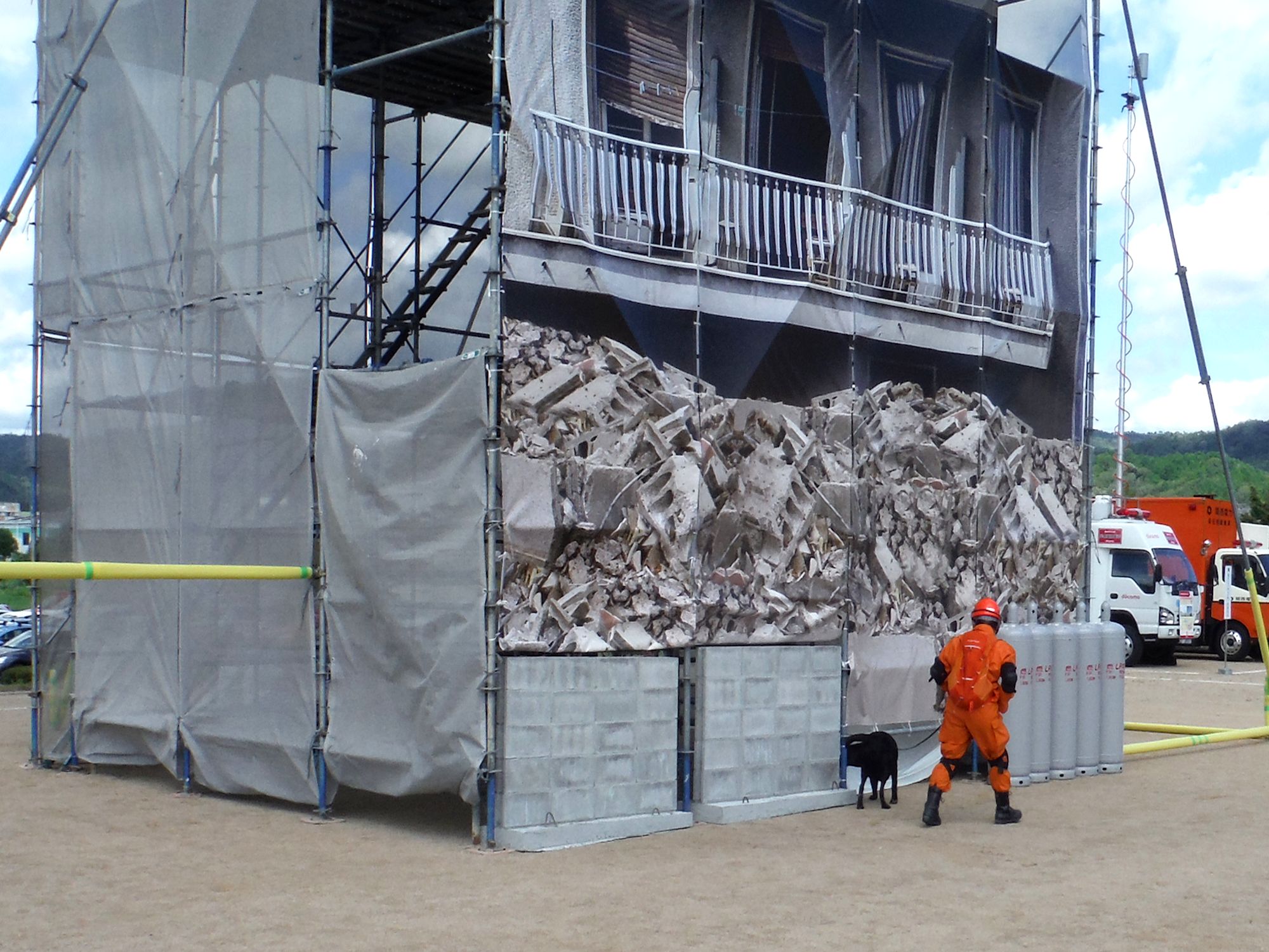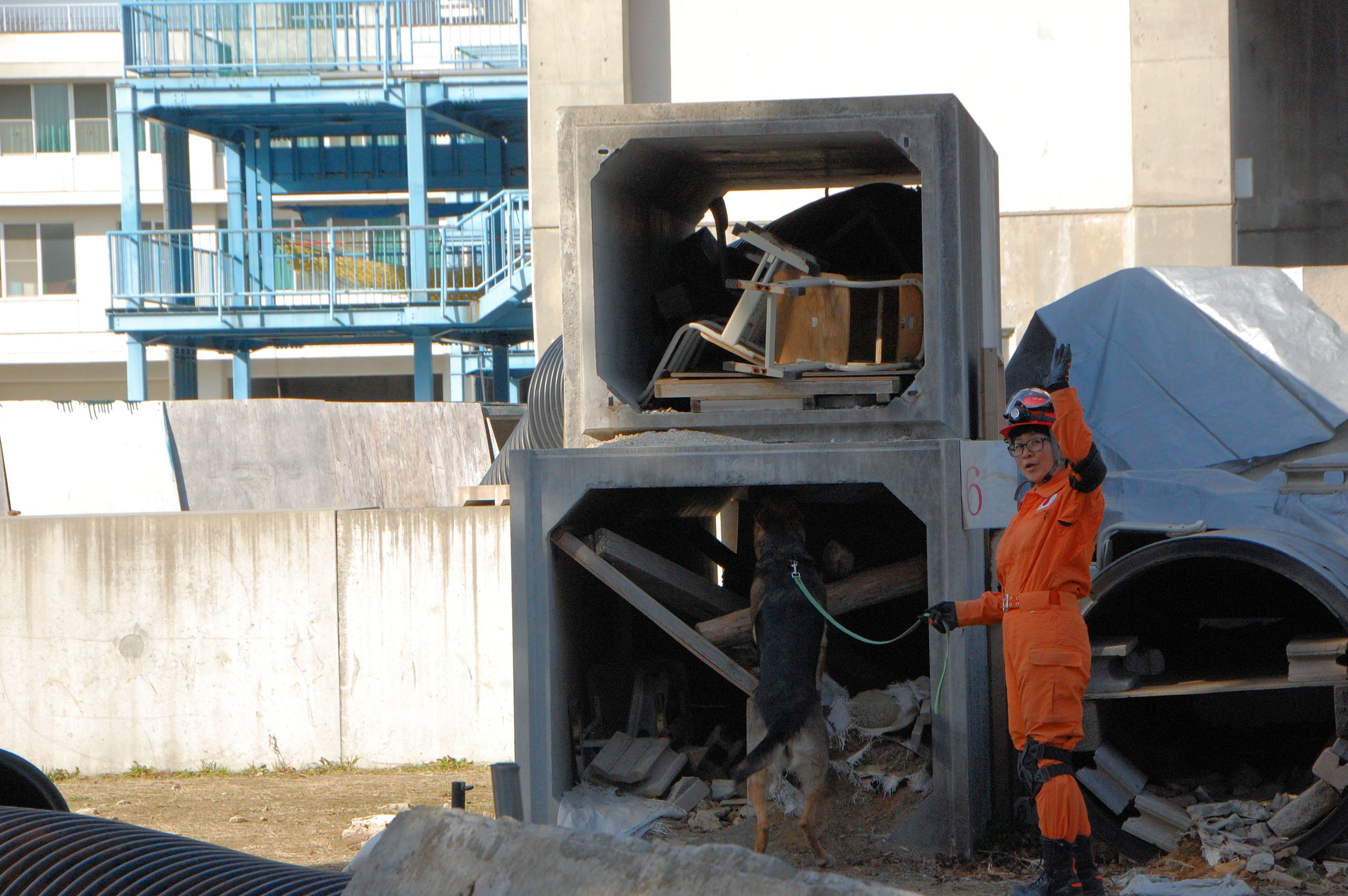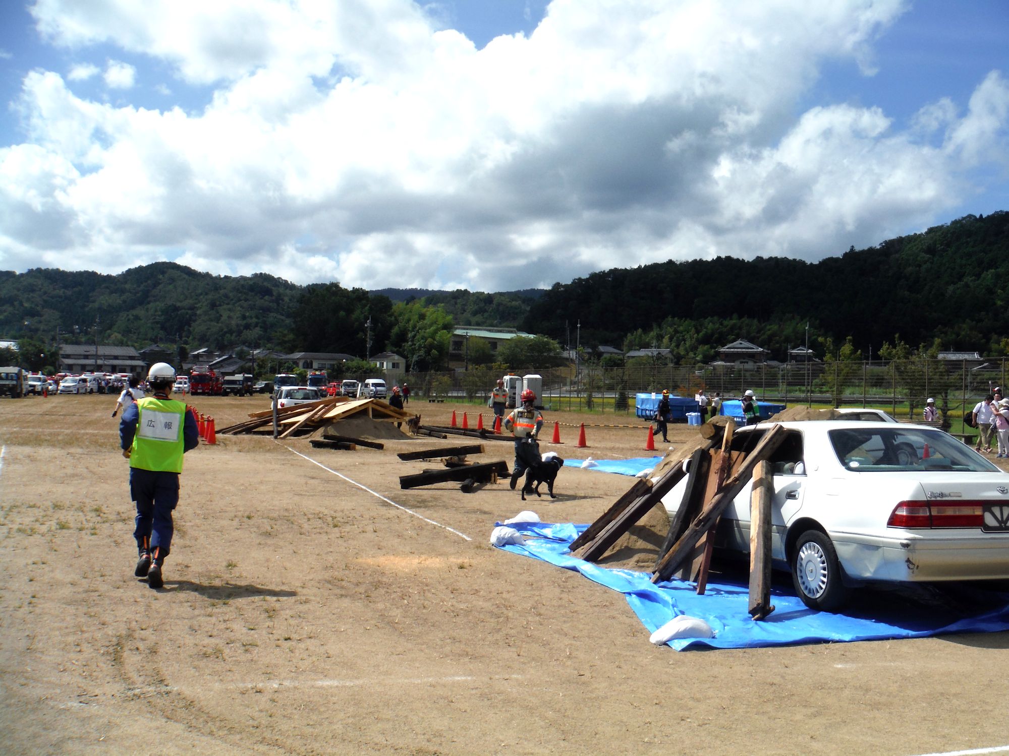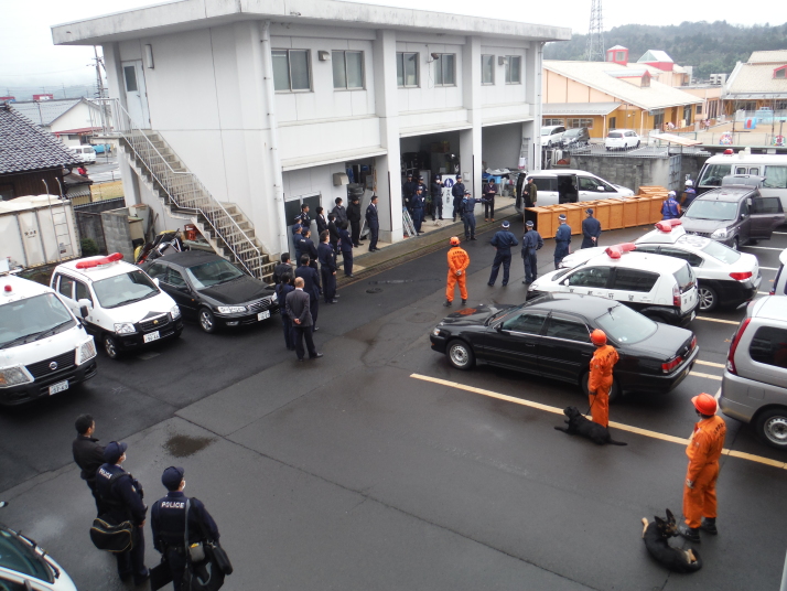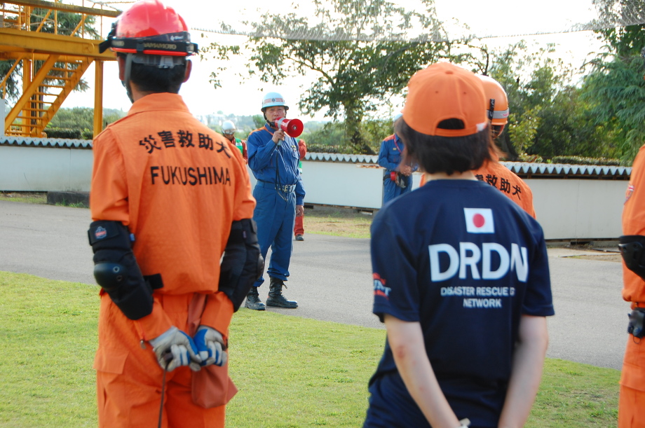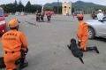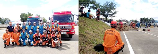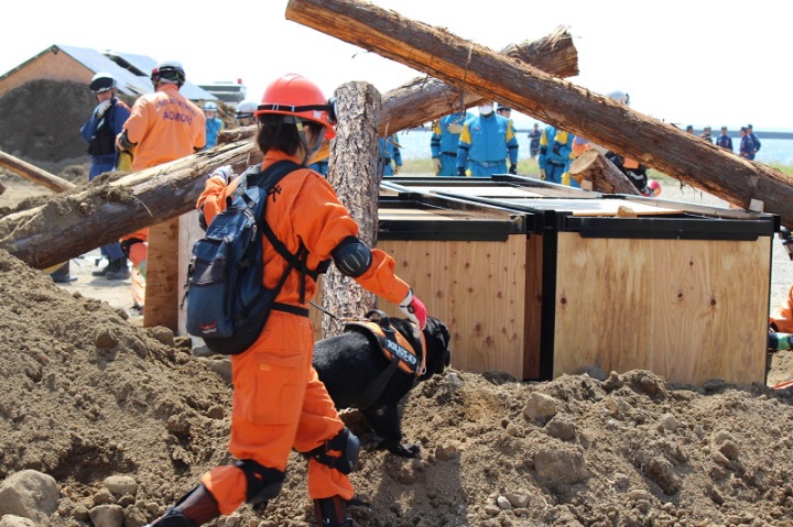 訓練は災害救助犬チームとして連携してあたり、土砂災害現場、倒壊家屋を巡回し災害救助犬の反応において救助隊を向かわせるというものである。現実にもあり得ることである。