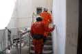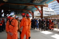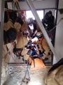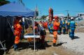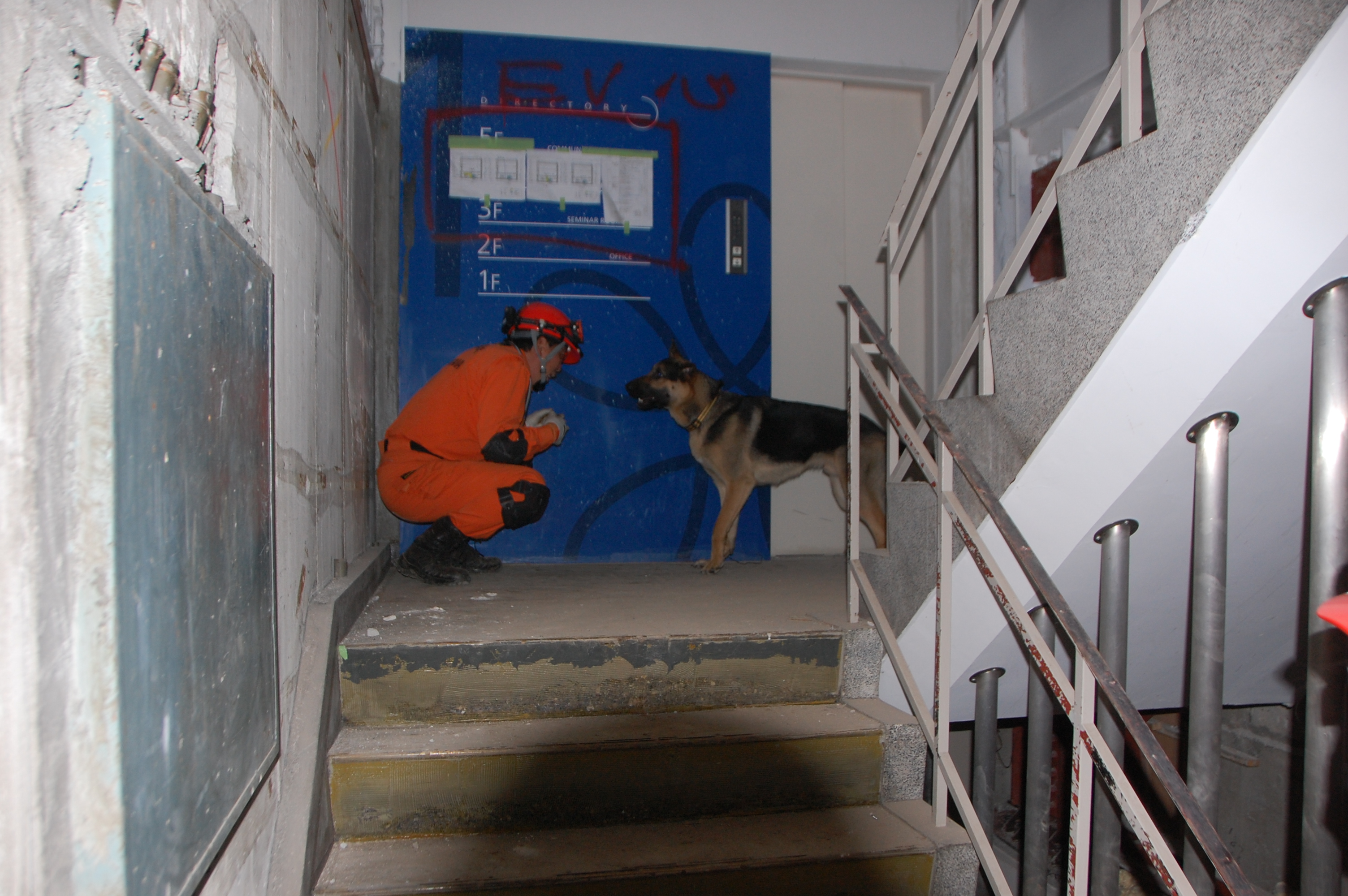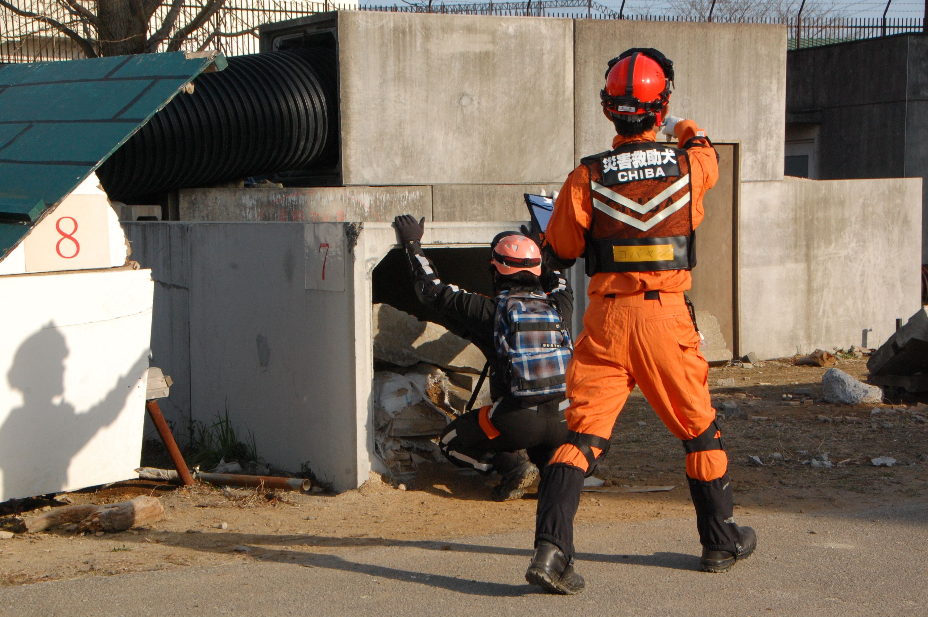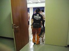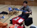 その後、実践的な捜索救助訓練で、まず初期の捜索を災害救助犬が担い、救助隊に結果報告し救助活動を行う、という連携訓練を行った。配分時間は5分間と短かったが、エリアを分け反応を示した場所をマーキングし報告を行った。狭いエリアであるので発見は確実にできたが、やはり訓練のための訓練の動きになっていたようだ。