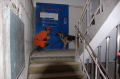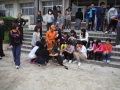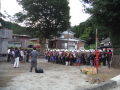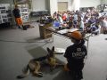 昨年が好評だったらしく昨年に続いての要請である。台風の影響で室内でのデモになった。犬にとっては声が響き落ち着かない、できる犬であると思われているのでハンドラーは緊張するが大きなミスもなく服従作業を見てもらった。自然に起こる拍手はありがたい。子供たいからハンドラーから憧れる存在になって若い人が活動に参加してくれることを願う。捜索デモでは子供たちに隠れてもらい、いつもながら子供たちは次から次と手をあげてくるので終りにくい。1時間の予定もオーバーして、終了後も外でふれあいをしていた。