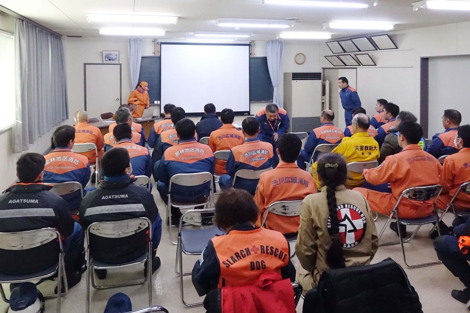 7組織53名28頭が集まり、渋川消防と捜索救助連携訓練を行った。