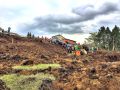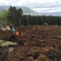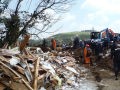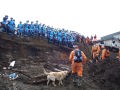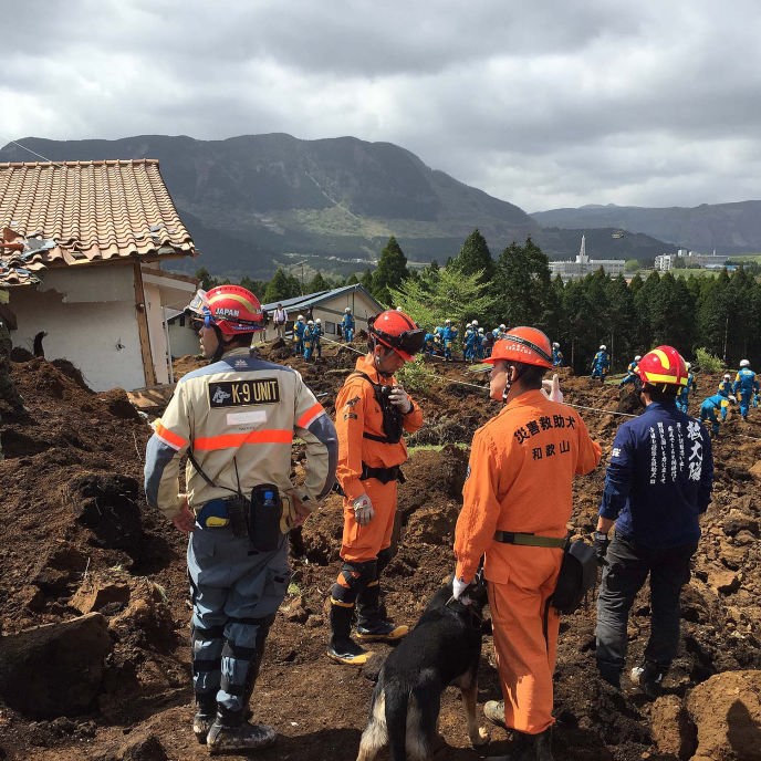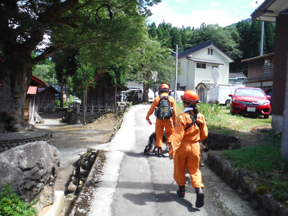 長陽庁舎内グラウンドに本部を設置、延べ8団体82名47頭が集結し自衛隊、京都府警、福岡県警、熊本県警などと7名の行方不明者がいるとのことで同村高野台地区で集中的に掘削して災害救助犬で確認、掘削確認を繰り返し検索を行ったが発見されたのはご遺体であった。