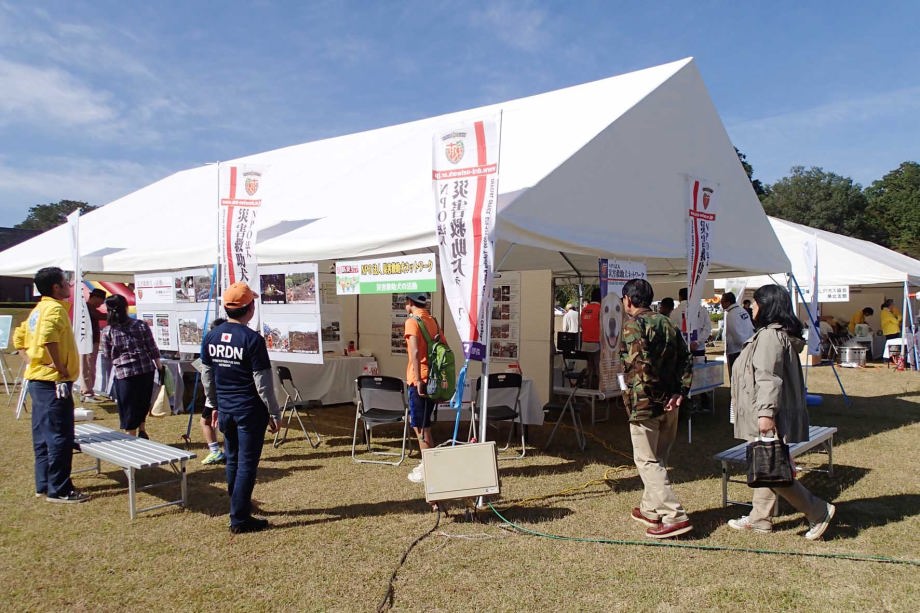 体育館の広報ブースでは組織案内、パネル展示を行い、学校での防災事業も兼ねており、中学生や地域住民とのつながりも体感できた。