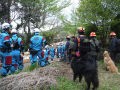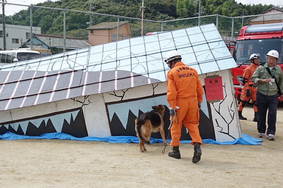 災害救助犬協会静岡と連携して対応した。シナリオがある防災訓練とはいえ互いの役目、動きを認識していなくてはうまく対応できない。時間に追われる流れであるが、何も知らない犬たちは指導手の指示が頼りである。初めての現場で犬たちは人の臭いを求めて淡々と作業をすることを救助隊にも知ってもらいたいと思う。