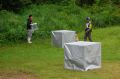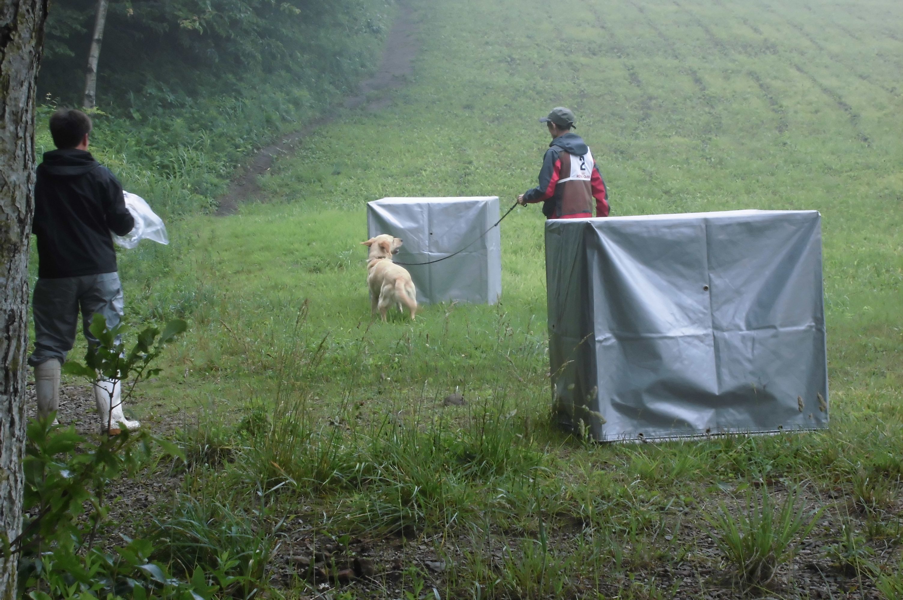 引き続き、捜索の作業の条件である風向き、臭いの誘因、生活臭、残臭への反応のデモを行った。3つのBOXには空、残臭、生体に分け、残臭にも反応するが、最終的には生体に辿り着き咆哮して要救助者を知らせるプロセス、実際をみてもらった。反応は必ずしも発見時だけではなく、ヒントである場合、錯覚である場合もある。犬が純粋であるが故に起こることであることも理解してもらいたい。