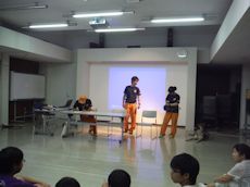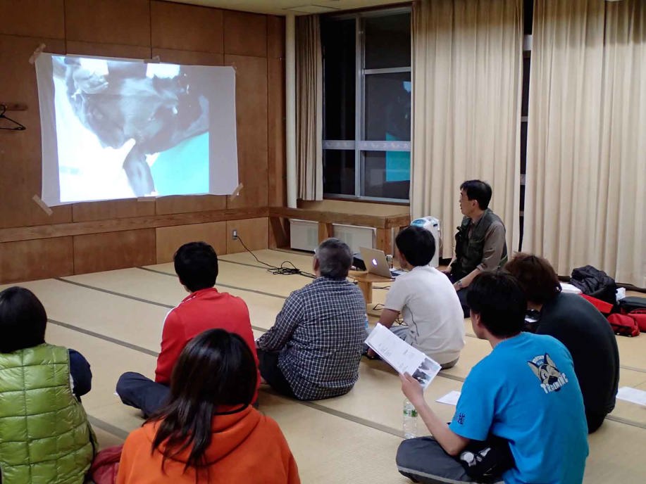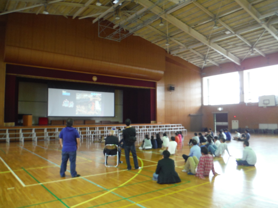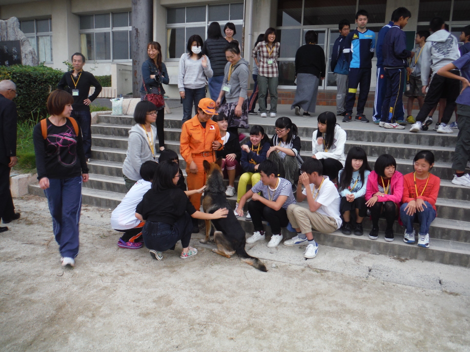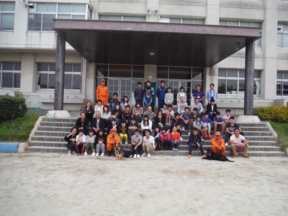 災害救助犬の映像を見せながら説明をして、なぜボランティアとして活動するのか、メンバーにも様々な動機があるであろうが、当会として考える理念、取り組みなどを事例をあげて話したが子供達には理解しにくい話であったろう。社会人となってボランティア、災害救助犬活動に関わってくれることに願っていることで結んだ。