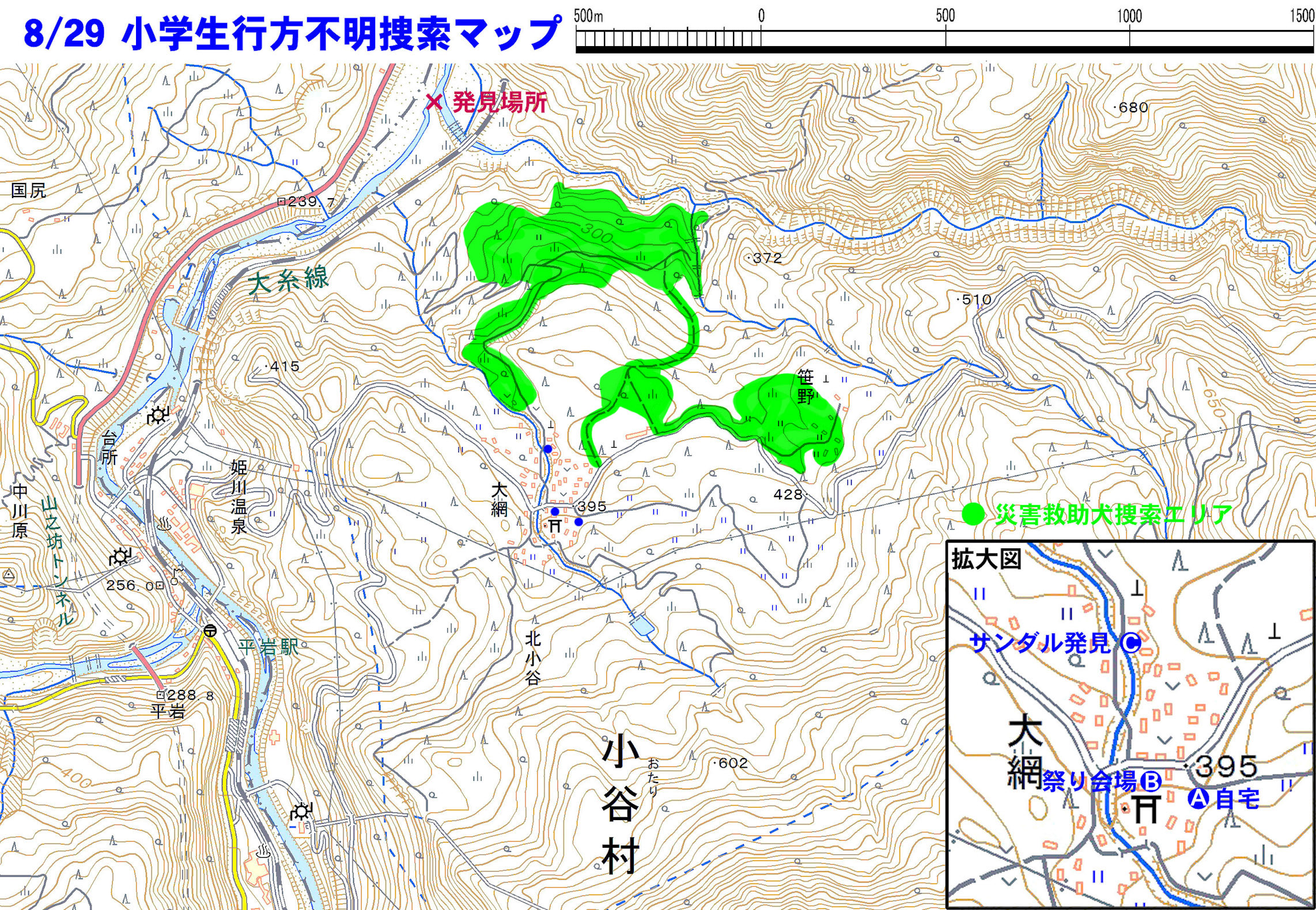 午前中は大網地区周辺を受け持ったが、人間の目で確認しきれなかったところは確認したので、救助隊が未確認の場所、捜索範囲外の場所を与えてもらうように進言し、地区外の姫川温泉の方に向かった昼頃、姫川の中で女の子を発見したとの連絡が入り本部へ戻った。本人と確認され捜索は終了となった。