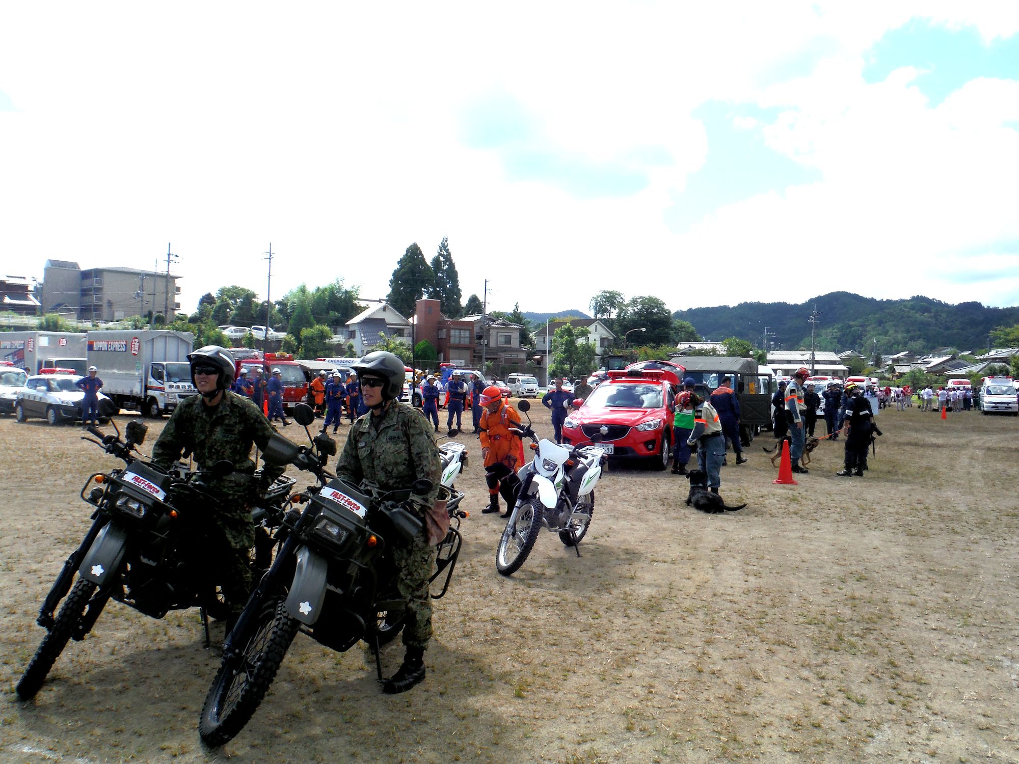 今年はドローンも参加して災害救助犬とともに空からと地上からの情報収集を行った。災害救助犬は発見の役目になることが今までであったが発災直後の情報収集係とは新しい使い方かもしれない。